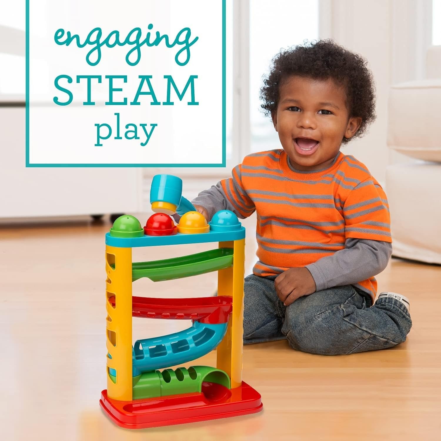 SUPPORTS HAND-EYE COORDINATION SKILLS: Your baby will bop each ball with precision until it drops through the ring. This fun activity boosts their hand-eye coordination skills, specifically their ability to aim at objects INTRODUCES CAUSE & EFFECT PLAY: Your baby will learn that bopping the ball through the ring creates a race down the ramp. They'll be motivated to complete this fun activity again and again ENGAGING STEAM PLAY FOR CURIOUS LITTLE MINDS: Your baby will love self-activating this engaging ball drop with two slides and two peek-a-boo tunnels. They can also match the balls to the ball rings by color SUPPORTS DEVELOPING FINE MOTOR SKILLS: 4 perfectly sized balls, 1 kid-friendly hammer, and 4 ball slots support your baby's fine motor skills as they grip, grasp, and explore these tools DESIGNED WITH LOVE: At Infantino, we love babies, we adore kids, and we admire their moms and dads. We work hard to create products that guide development and bring joy as your baby grows. Happy parents and little ones are what we are all about