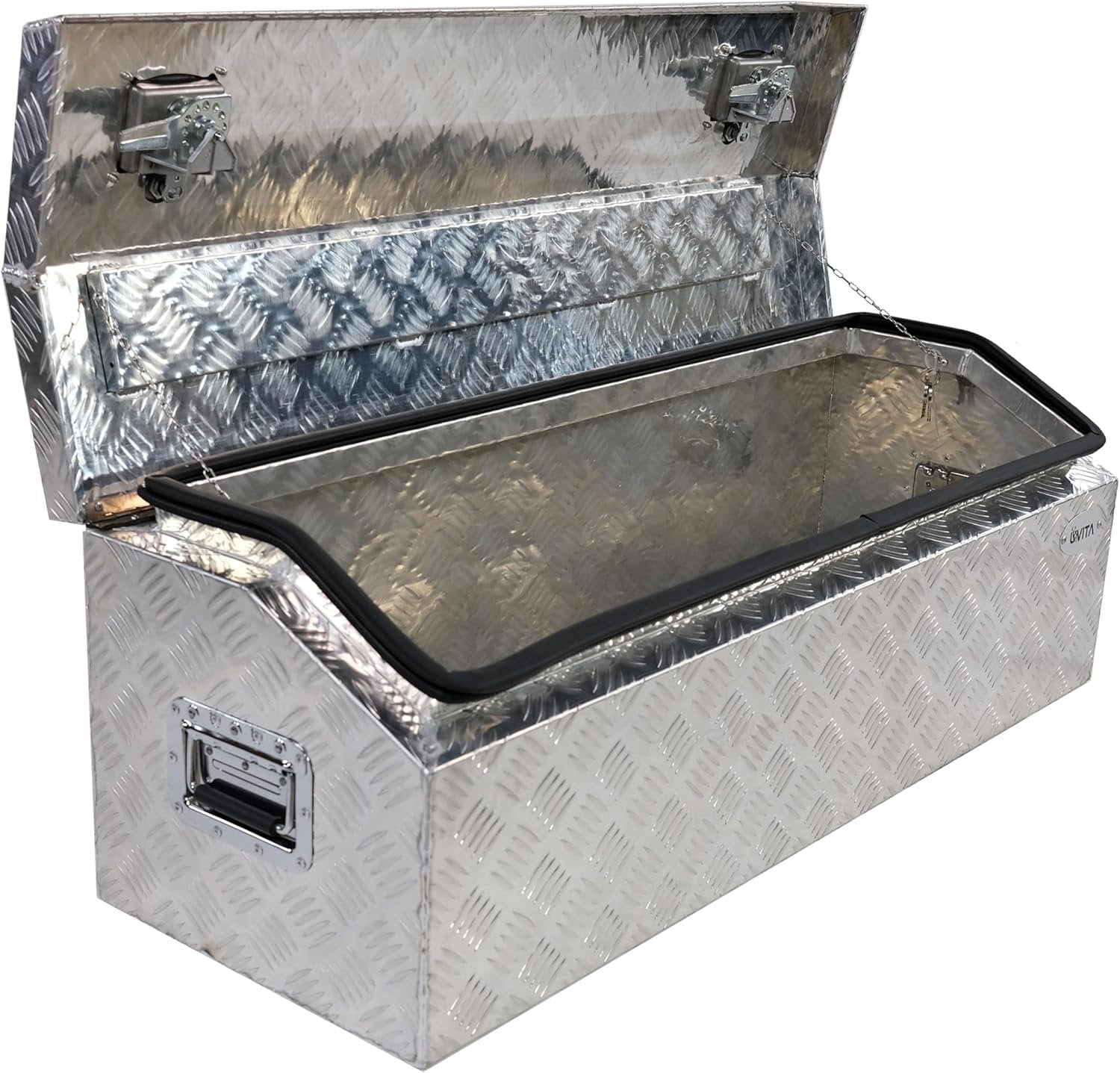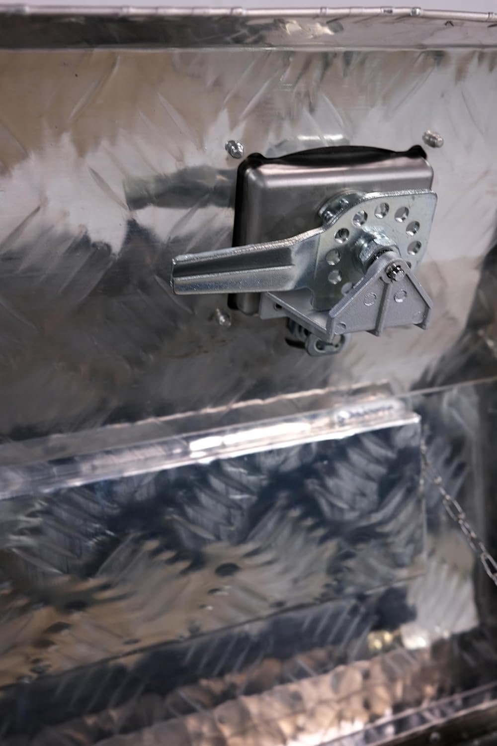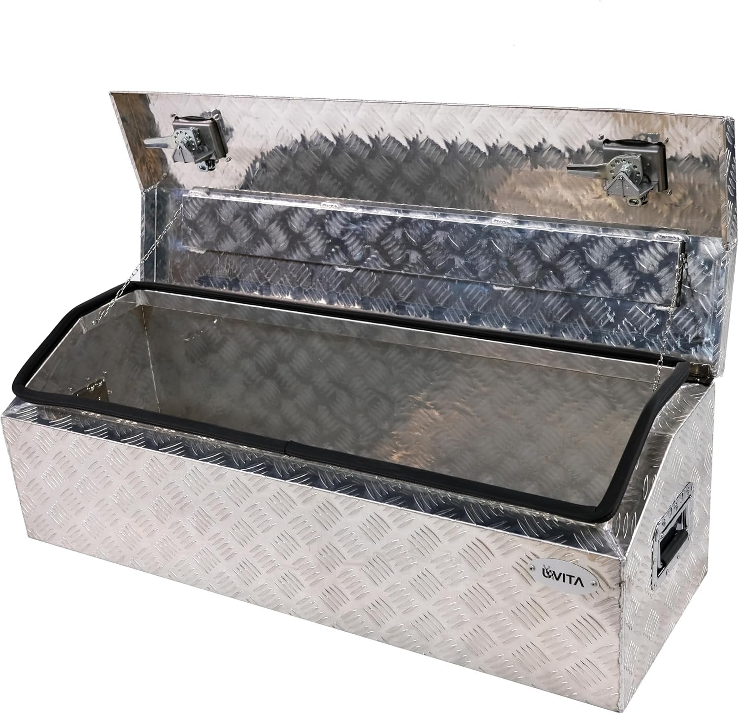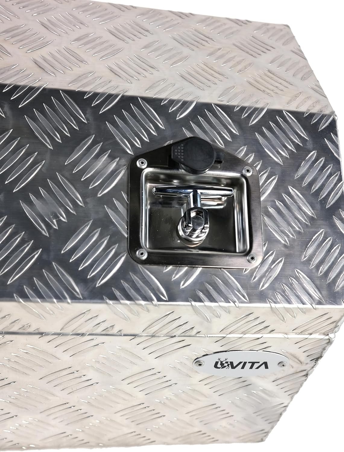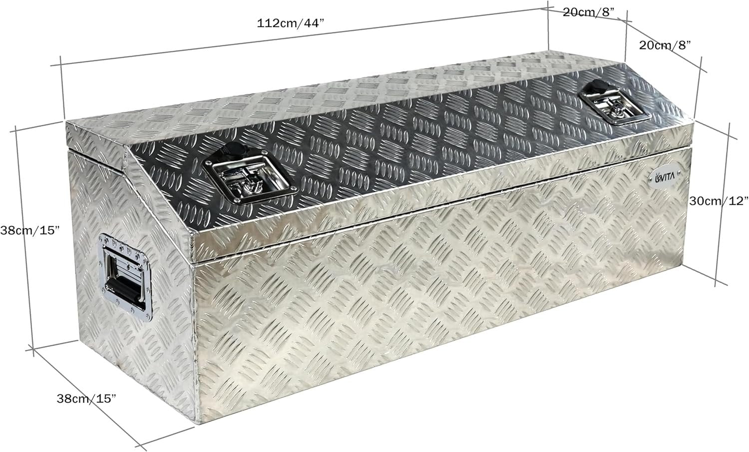 Overall Size:44''x15''x15'' Surface Finish: Semi- Polished Aluminum; Strengthens the Aluminum for Maximum Durability The toolbox is designed to save space and provide extra storage in your truck bed. This toolbox is constructed of heavy-duty textured aluminum for maximum durability. The door features an over-hanging lip which resists water from getting inside. The fold-up door provides full access. The built-in lock ensures all items are kept safe and secure. This aluminum underbody toolbox is perfect for storing your tools in your vehicle or at home. With Lock and 2 Keys: This aluminum box has a lock and 2 keys to safely use to prevent things from being lost. Perfect Tool Cabinet for Anywhere: This toolbox can be mounted on a hitch rack, or cargo rack of your camper, perfect for the tongue of your enclosed trailer, and suitable to be installed on the rear of your RV for extra storage.