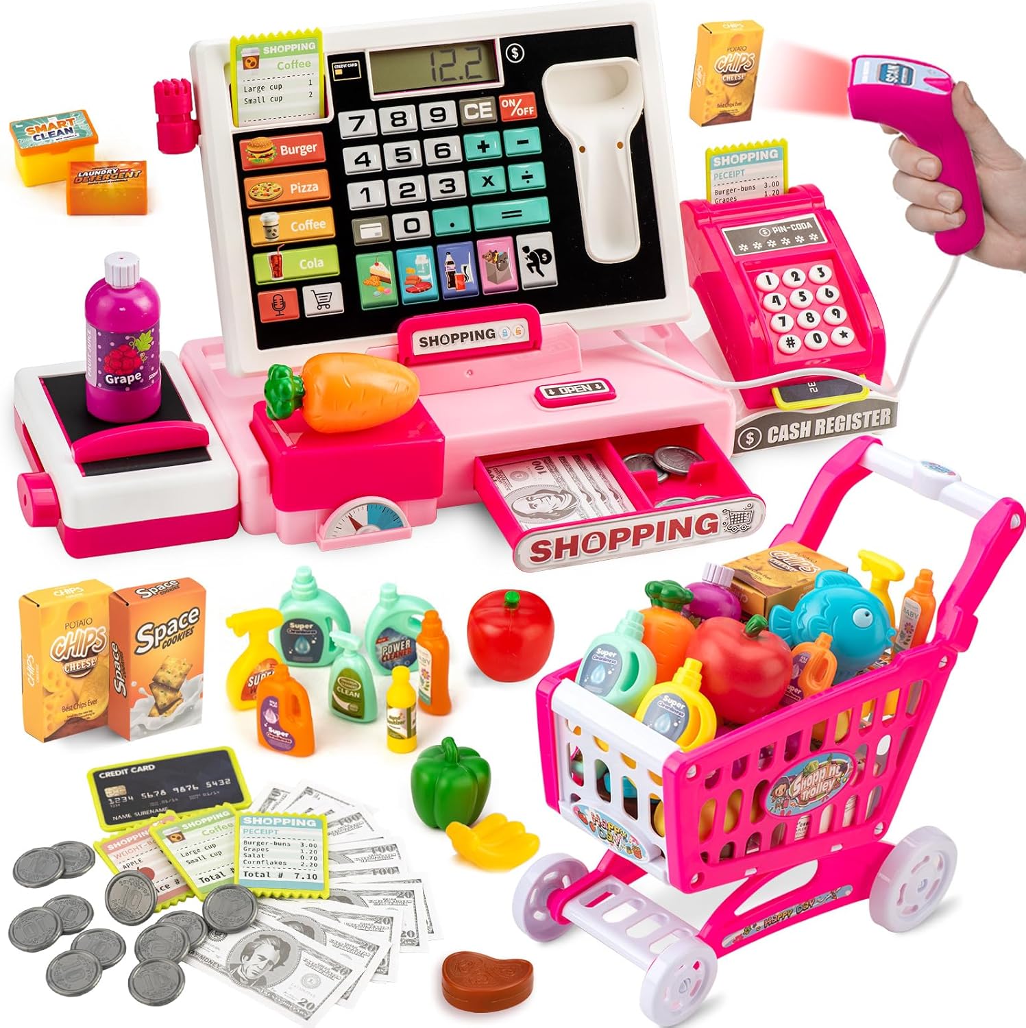 Interactive Kids Cash Register Toy - Educational Pretend Play Store Set with Shopping Cart, Includes Music, Real Calculator & Scanner - Ideal Birthday Gift for Girls & Boys Ages 3-8 (Red-Pink)