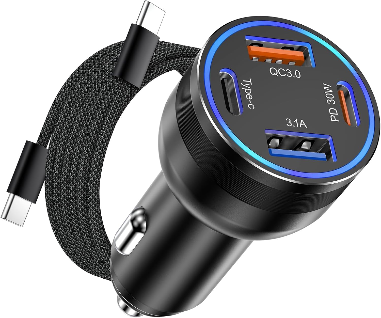 PD 30W & QC 3.0 USB C Car Charger: USB C Car Adapter with 4 Ports (2 USB-C + 2 USB-A) supports PD3.0 and Quick Charge 3.0 fast charging functions with a total power up to 65W. PD port 30W max output, perfect for quickly powering smartphones, smartwatches, charges most devices from 0% to 880% within 830 minutes; whillw QC 3.0 18W output port, charge iPhone 15 Pro from 0-60% in just 20 minutes, 5 times faster than a standard car adapter; Type-C port and USB-A port provide a 3 constant .1A/5V.