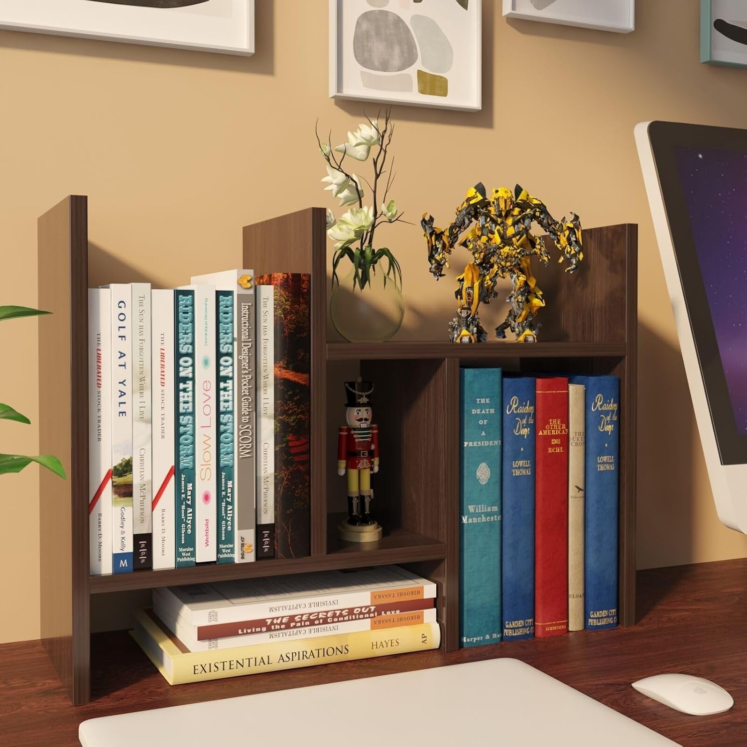 Jaycomey Desktop Organizer Office Storage Rack Adjustable Wood Display Shelf Counter Top Bookcase Dark Walnut