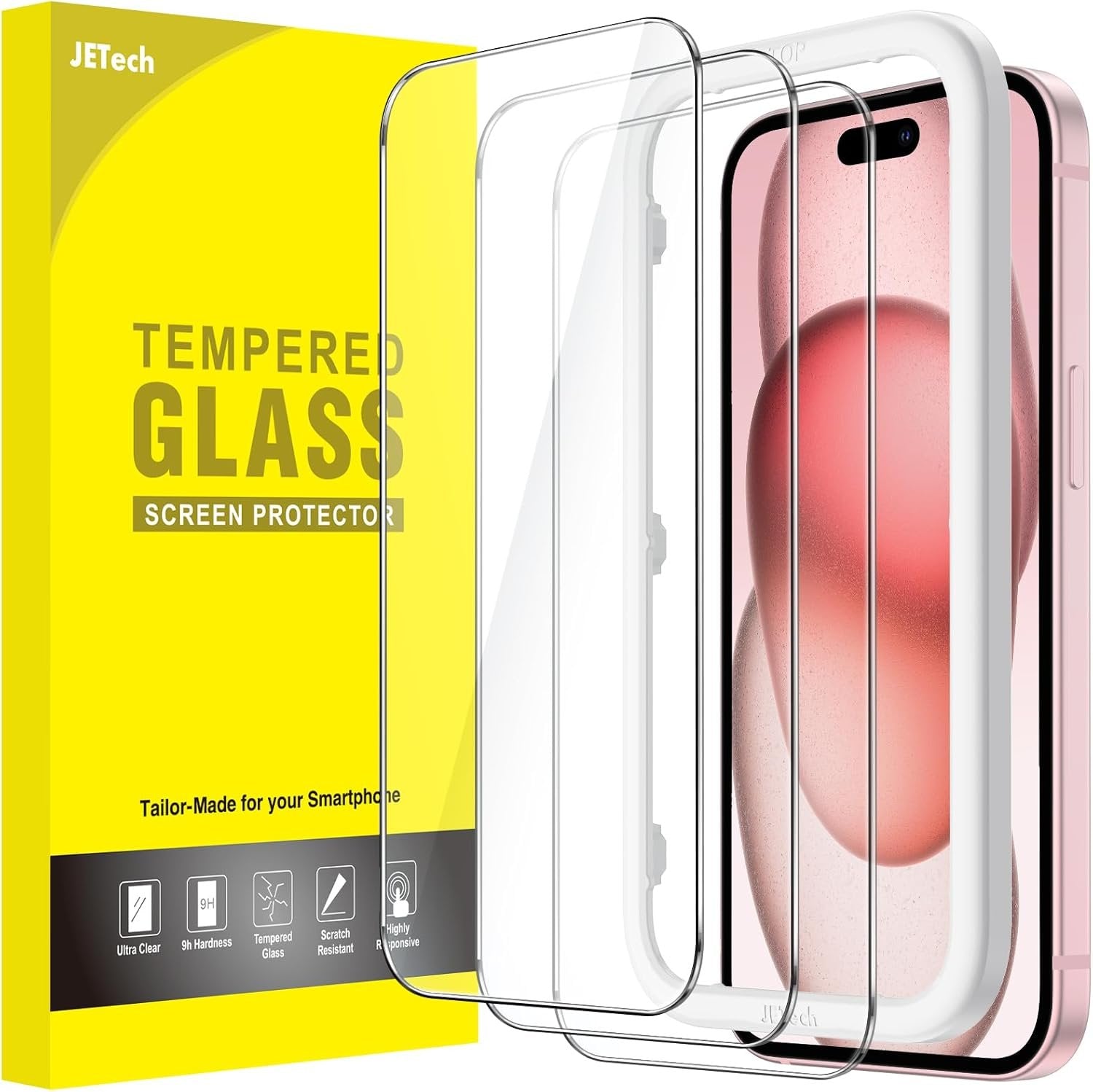 JETech Screen Protector for iPhone 15 6.1-Inch, Tempered Glass Film with Easy Installation Tool, Case-Friendly, HD Clear, 3-Pack