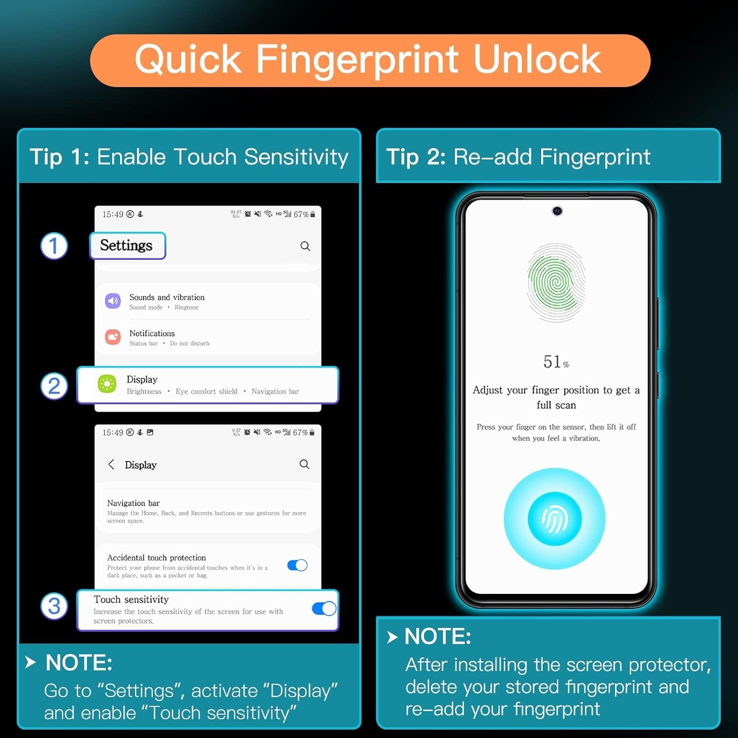 [Fingerprint Unlocked] Designed for Samsung Galaxy A54 5G 6.4-Inch. For a better unlocking experience, please go to Settings of your device to activate the Touch Sensitivity and re-enter your fingerprint after applying the film [Premium Material] Built with 9H high hardness tempered glass. Highly protect the screen from unwanted scratches and abrasions [Ultra-Clear] Featuring 99.9% light transmittance, this screen protector brings you the most natural viewing experience [Fingerprint & Oil-Proof] The hydrophobic and oleophobic coating prevents fingerprints, oil residue and sweat from gathering on the screen. Always maintain a clean screen environment for you [Case-Friendly] Extra space is left around the borders for your case to wrap around the edges of your phone. Compatible with most phone cases