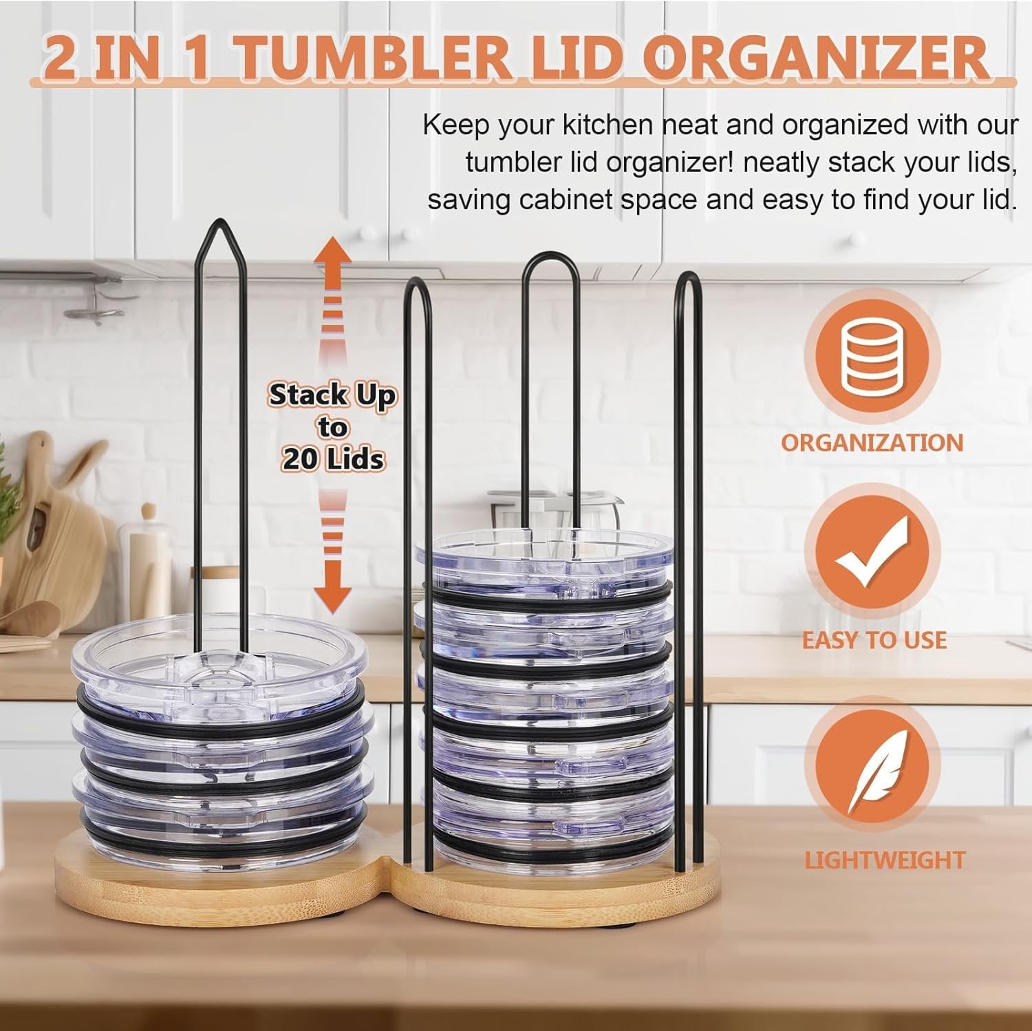 2 IN 1 Tumbler Lid Stacker: Innovatively Designed as a 2 in 1 cup lid holder storage, capable of accommodating up to 20 lids of various tumbler lid types, maximizing your need for kitchen and countertop organization space. Storage Space Maximization: The vertical stacking design of this tumbler lid organizer minimizes storage space usage, making lids easily accessible in your cabinet, it is a great space-saving ideal for your small kitchen, apartments, or any space where efficiency is key. Premium Natural Material: Our cup lid organizer is crafted from natural bamboo and sturdy iron, lightweight, resistant to deformation, and durable ensuring long-time use. The lid storage organizer is a friendly option that's perfect for your home needs. Design with slip-proof on the base of our cup lid storage organizer to stand firm, preventing any unwanted sliding or tipping. Home Organization Must Have: Say goodbye to kitchen lid clutter and countertop organization, our tumbler lid organizer is the best solution for organizing lids of cups. Secures your tumbler lids precisely, keeps your cabinets organized, and allows for quick retrieval of the needed within seconds. Detachable Design: Features a detachable design of our stacking cup lid holders for easy storage and use, providing your home with a tidy. Easy to install, simply insert the stick of the lid organizer holder firmly into the round hole position of the base and adjust as needed.