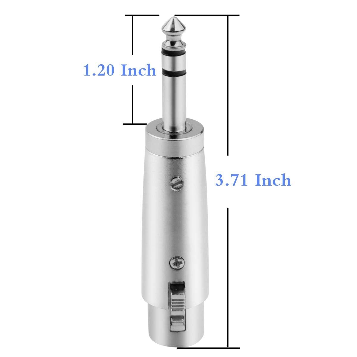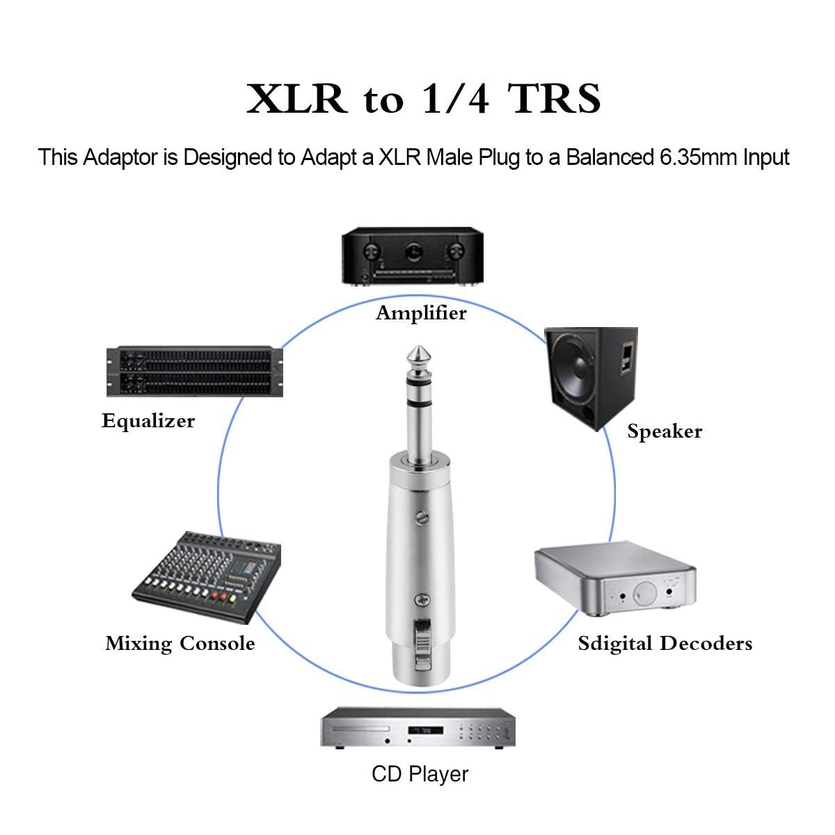 [Functional Design] Balanced XLR female to 1/4" TRS adapter is designed to convert balanced XLR output to balanced 1/4" TRS jack input. Connector A: 3-pin XLR female connector; Connector B: 1/4" TRS stereo jack male plug. [Connection Principle] The 3-pin XLR female to 1/4-inch TRS male adapter is connected by connecting XLR pin-1 to the 1/4-inch plug sleeve, XLR pin-2 to the 1/4-inch plug end, and XLR pin-3 to the 1/4-inch plug ring. [High-Quality Transmission] The XLR female to 1/4" TRS adapter is a premium metal shielding type, high-strength zinc die-cast nickel-plated housing that eliminates RF and EMI noise and ensures lossless signal transmission. [Durability] The 1/4" TRS male to XLR female adapter features a rugged metal housing for superior durability and protection against wear and tear; the exterior is secured with screws to make the connector more secure and reliable. [Multi-purpose] The XLR to 1/4 adapter is plug-and-play, suitable for mixing consoles, microphones, amplifiers, equalizers, keyboards, guitars, electronic pianos, electronic drums, and other professional audio equipment.