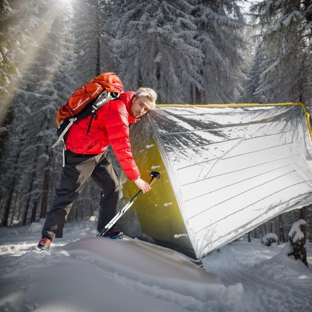 【Material】Survival tent and is made of mylar with a tear resistant,puncture resistant coating,It's durable and reusable,so it can be folded and placed in a waterproof backpack. 【Package】1 Piece (Length and height: 98.4 x 59 in) life tent for survival (weight 0.6ib),large size can support full body protection. Practical and convenience,It's a tube tent that comes with a "rope"/ridge line to run under the top so it will keep its shape,Compact easy to carry in backpack. 【Feature】This emergency shelter heat reflective propertie in cold conditions insulated lining reflects 90% of body heat and helps insulate in extreme cold,It can be easily stored in the car,emergency first aid kit,and more. 【Quick Installation】Simply thread a jump rope through the ends of the survival shelter and tie it between two trees or a sturdy object 3-4 feet off the ground,Use rocks to secure the corners of the tent,If there are no trees around,emergency shelter can also be used as an emergency sleeping bag,emergency bib,space blanket. 【Application】Reusable tent packs easily for hiking gear,running,camping,car first aid kits,hiking essentials,emergency kit,camping supplies,hiking equipment.