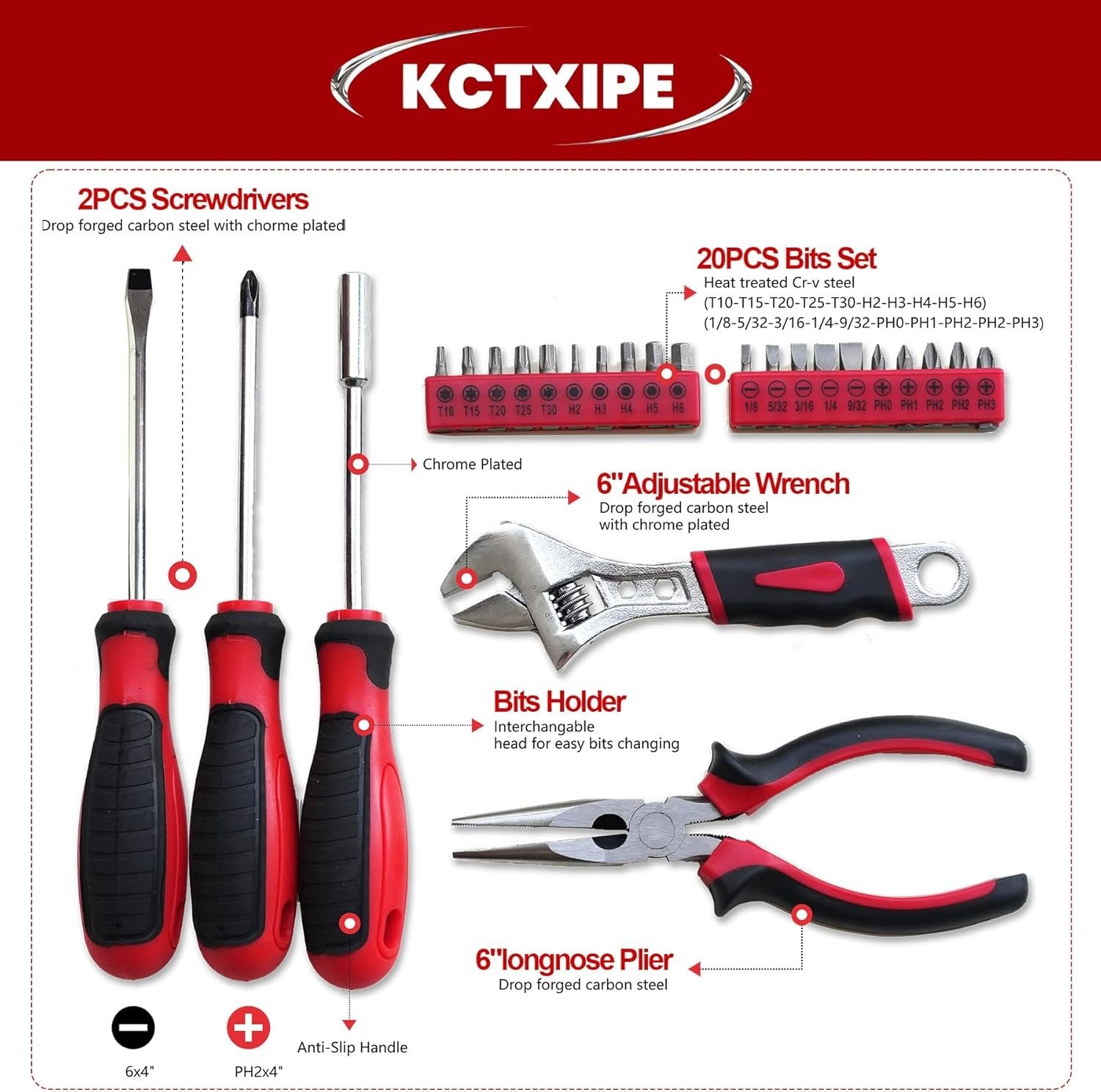 Premium Durability & Comfort:This household tool kit is crafted with high-carbon chrome steel for corrosion resistance and TPR ergonomic handles for anti-slip, anti-fatigue grip. Built to withstand heavy-duty tasks while ensuring user comfort. Complete Starter Kit for Every Need: This basic tool kit are includes basic essentials: tape measure, claw hammer, adjustable wrench,1/4" ratchet set, screwdrivers, hex keys, torpedo level, and fastener sets. Perfect for repairs, assembly, and DIY projects. User-Friendly for All Skill Levels:Tailored for first-time users, women, and college students. Simplified organization with labeled compartments ensures hassle-free storage and easy identification of tools. Designed for Portability & Accessibility:12-inch reinforced 600D nylon tool bag kit features a wide-mouth design for quick tool access. Lightweight and compact, ideal for students, beginners, or on-the-go use in apartments, dorms, or offices. Versatile & Thoughtful Gift Solution:A practical gift for housewarming, birthdays, or holidays. Combines professional-grade quality with beginner-friendly usability, making it a go-to toolkit for everyday challenges.