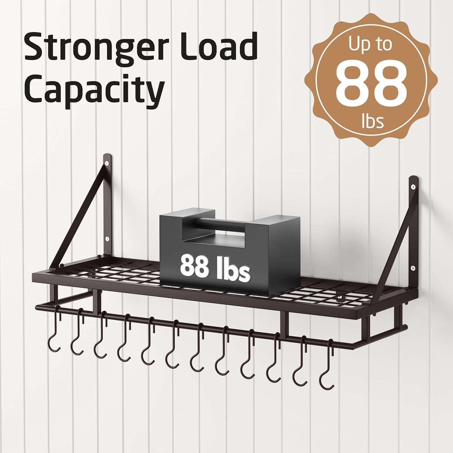 Free Up Cabinet Space: KES pot rack hanging measures 29.9" by 9.8" and is sturdy enough to storing all your pots and pans in one place. No more crouching or rummaging through cabinets——just grab and cook Built Stronger to Last Longer: Crafted with a heavy-duty structure and thicker materials, this pot hangers for kitchen holds up to 88 lbs. Unlike cheaper options with flimsy metal or unstable expandable structures, our reinforced grid shelf and welded joints support your heavy dutch oven Reinforced Hooks: Whether hanging heavy pots or ladles, the extended hooks won’t slip or fall off. Designed for durability, they offer secure storage for your most used cooking tools Oiled Bronze That Blends Right In: The oiled bronze finish adds a soft, elegant touch that works with any kitchen style—vintage, rustic, or farmhouse. A timeless look without trying too hard Secure 16" Stud Mounting: Each shelf features two mounting holes spaced 16 inches apart. With the included heavy-duty stainless steel screws, this pots and pans storage stays firmly in place, providing a stable and safe storage solution Easy Installation: Screws, anchors, and wrench are included! No need to search for tools or visit a hardware store. Step-by-step guidance and 24/7 support to ensure a smooth setup