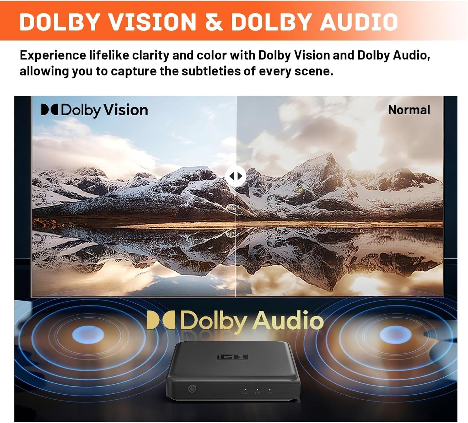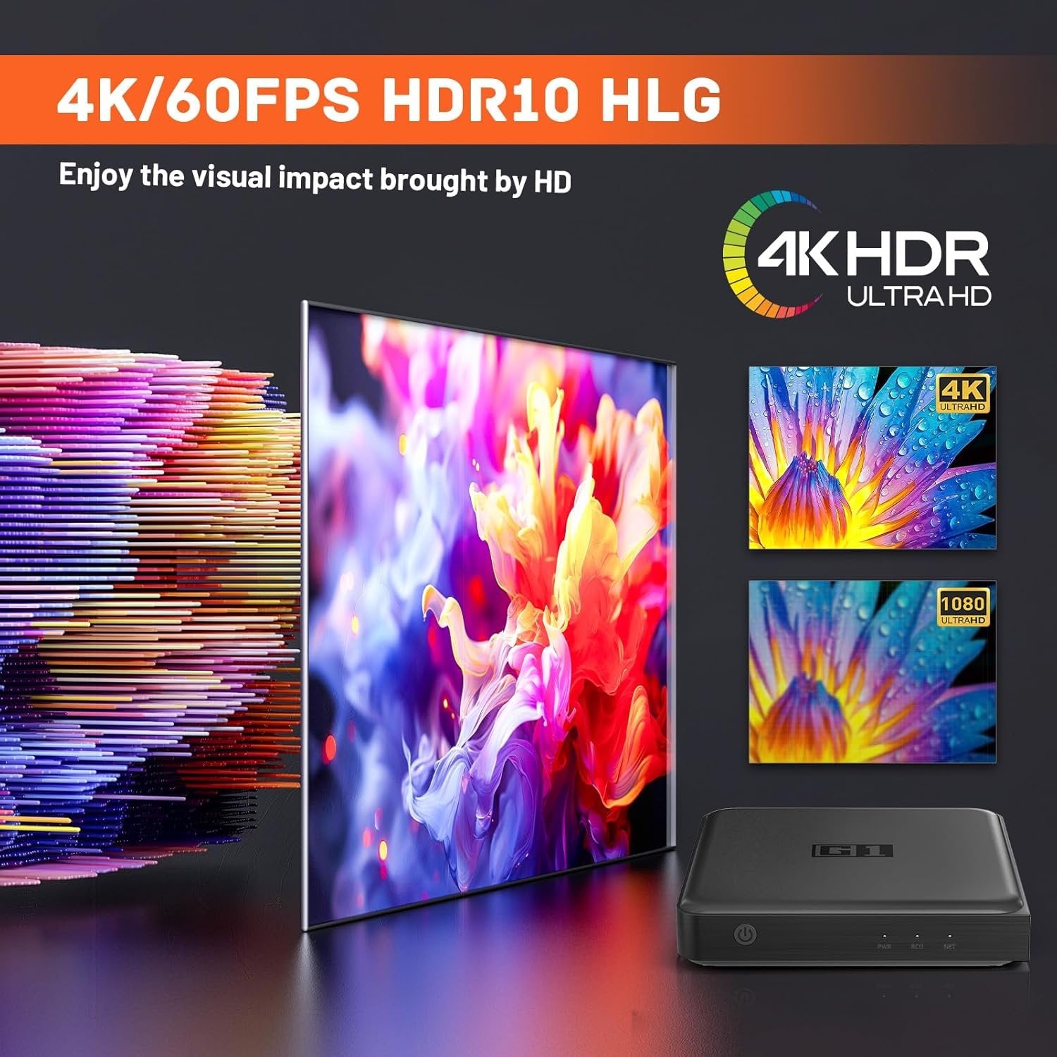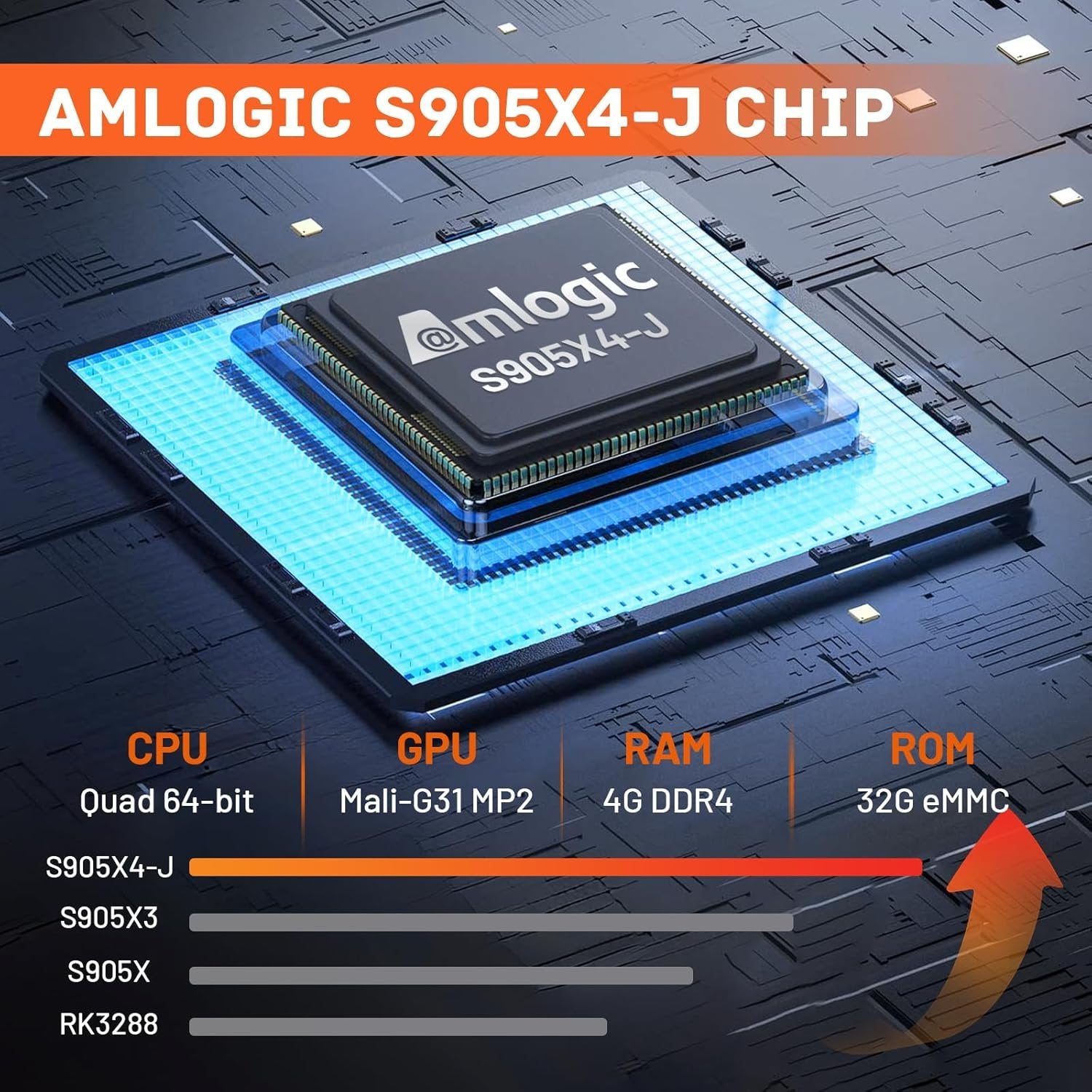 【Google & Netflix Dual Certification】: G1 TV box is with Android 11.0 TV system, compatible with Google & Netflix dual certification, can download games through Play store, Enjoy a great Netflix 4K streaming experience. Ideal for family entertainment with a movie-like viewing experience. 【 Shocking Audio-Visual Experience 】:TV box 4K features the latest 4K HDR 10+ and AV1(30% more efficient than H.265 or VP9) decoding technology to provide authentic 4K@60fps playback. It supports DolbyAudio and Dolby Vision, and the built-in Chromecast lets you stream images from your phone to the big screen. 【4GB RAM + 32GB ROM】: G1 smart TV box uses Amlogic S905X4-J quad-core Cortic-A55 UHF CPU, excellent storage space, you can download more movies, games, do not have to worry about space shortage. Also support TF card expansion. 【Voice Remote Control】:Equipped with dedicated YouTube, Netflix, Prime Video, buttons for easy access. With the Voice remote control, you can quickly access entertainment, get answers, and control devices in your home. Just press the mic button on the remote to get started. It makes home devices smarter and more convenient. 【WiFi 6】: Android tv box 2024 supports wifi 6, with a maximum rate of 9.6Gbps, which can provide faster network speeds and supports BT5.0.
