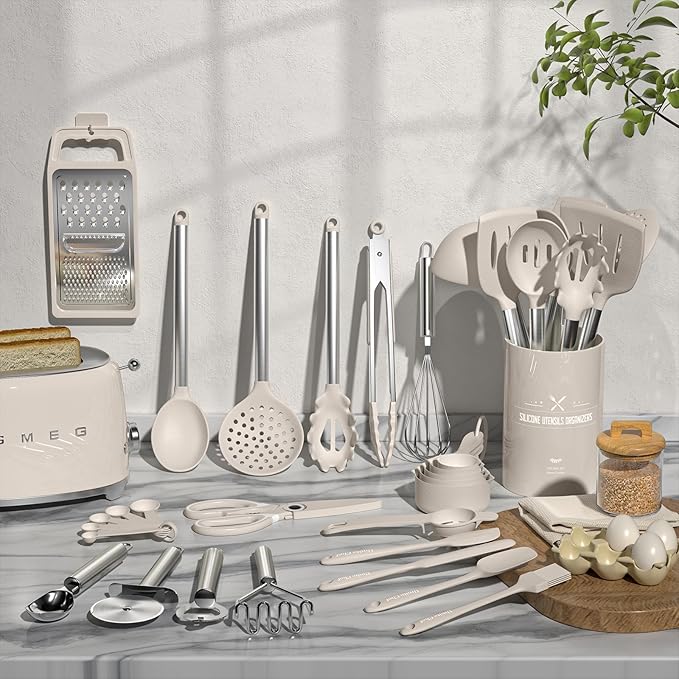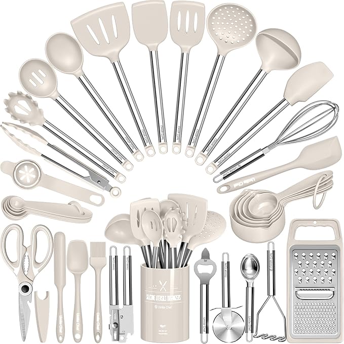 Kitchen Utensils Set-Umite Chef 34 Pcs Silicone Cooking Utensils Set for Nonstick Cookware-Silicone Spatulas Set, Stainless Steel Handle-Khaki Kitchen Gadgets Tools, Pots and Pans Accessories