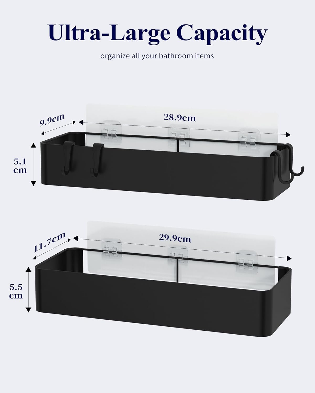 PREMIUM RUSTPROOF MATERIAL: Kitsure shower racks for inside shower feature 100% stainless steel and thickened coating, which is rustproof, waterproof, scratch-free, and durable for long-term use. In addition, with a smooth and easy-to-clean surface, you can just rinse the shower caddy and leave it to air dry. LARGE CAPACITY: The two Kitsure large shower caddies measure 29.9cm and 28.9cm respectively. They are large enough to store all your bathroom items, such as body wash, shampoo, conditioner, and facial cleanser. The heightened guard rail can effectively prevent your items from accidentally dropping down. STRONG ADHESIVE TAPES: With 2 high-quality adhesive tapes, each Kitsure rust-proof shower caddy can easily hold up to 8lb for a long time. Let Kitsure shower storage shelves keep your bathroom necessities in place, securely and stably. The package comes with 4 fixing snaps that keep the shower racks steady without shaking. QUICK DRAINAGE: The hollow design of the bottom makes Kitsure large shower organizer drain the water quickly and smoothly, keeping your shower accessories clean and dry. No more water remains at the bottom to damage the racks and your items! Besides, there are 2 round holes at the bottom, which can store the bottles upside-down for easy dispensing. DRILL-FREE INSTALLATION: Kitsure drill-free shower caddy is super easy to install without screws, gel, or any special tools, and it will not damage the wall at all. The adhesive tapes are removable. Just heat the surfaces with a hair dryer for 5 mins and peel them off. (NOTE: Please install the shower caddy on smooth and sturdy surfaces.)