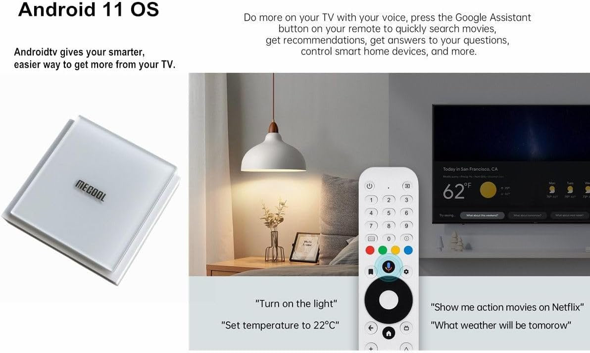 KM2 PLUS Deluxe is 4K HDR ATV Box, equiped with Amlogic Amlogic S905X4 Quad core ARM Cortex-A55, 24000 DMIPS CPU, ARM Mail-G31 MP2 processor, ARM G31 MP2 GPU, Support AV1 encoded and 4K HDR content, enjoying fantastic video viewing experience. More bright-coloured video for less data, 20%-30% saving. Android TV 11.0 OS, perfect for home entertainment, home theater, business use. Netflix 4K TV Box, you can enjoy high clarity Netflix films, and TV Series on your big TV Screen. Endless Android TV Apps on Goog-le play including streaming content projects from Netflix, Prime Video, Youtube. KM2 PLUS Deluxe with DDR4 4GB RAM eMMC 32GB ROM. WiFi 6, Dual WiFi connectivity for efficient, stable data and video output on your device 24/7. 2.4G/5.0G dual-WiFi and 1000Mbps LAN run internet, streaming and audio perfectly without jerking, which allows you to play 4K 60fps, H.265 videos smoothly. Easily cast photos, videos, and music from your phone, tablet, or laptop to your TV with Chromecast built-in. Enjoy the big-screen entertainment. Supports AV1 Decording, HDR10+, HDR10, HLG HDR processing, and enjoys an ultra-high-definition, lifelike viewing experience. Package contents: KM2 PLUS Deluxe Box, 12V/1A Power Adapter (US Plug); HD Cable; BT Remote Control; Quick Start Manual
