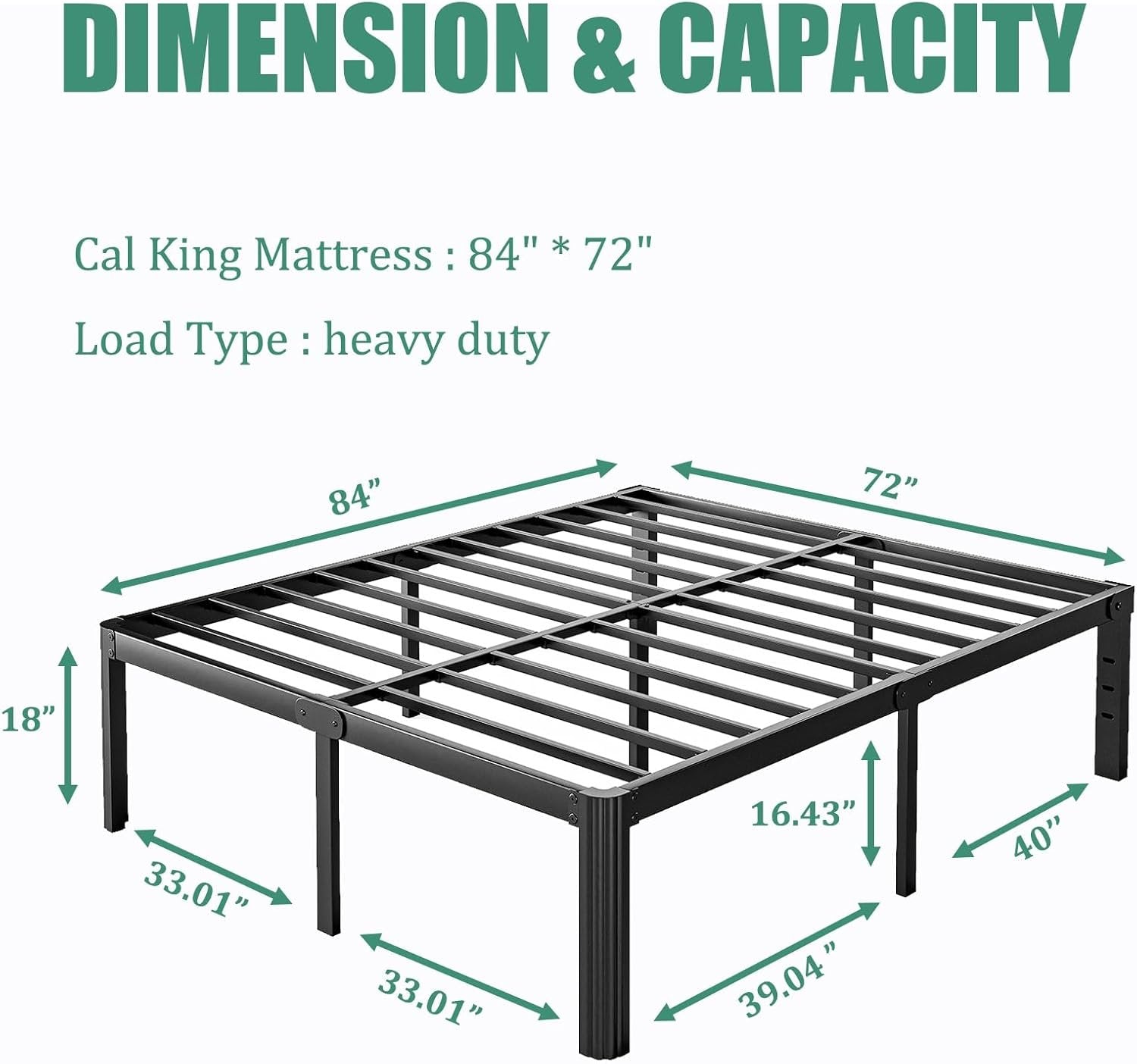Noise Free: Special materials and structural design reduce the possibility of the cal king bed frame generating noisy sound Heavy Duty: Our metal cal king bed frame is made of high-quality iron material, providing excellent load-bearing capacity and durability to support both the mattress and the sleeper Easy Assembly: With our simple step-by-step instructions, you can effortlessly assemble your cal king platform bed frame in no time, saving you valuable time and energy Space Utilization:Our cal king platform bed frame features a flat panel design that effectively utilizes the available space underneath No Box Spring Needed: Say goodbye to bulky box springs our robust cal king bed frame is designed to support your mattress directly, saving you space and money