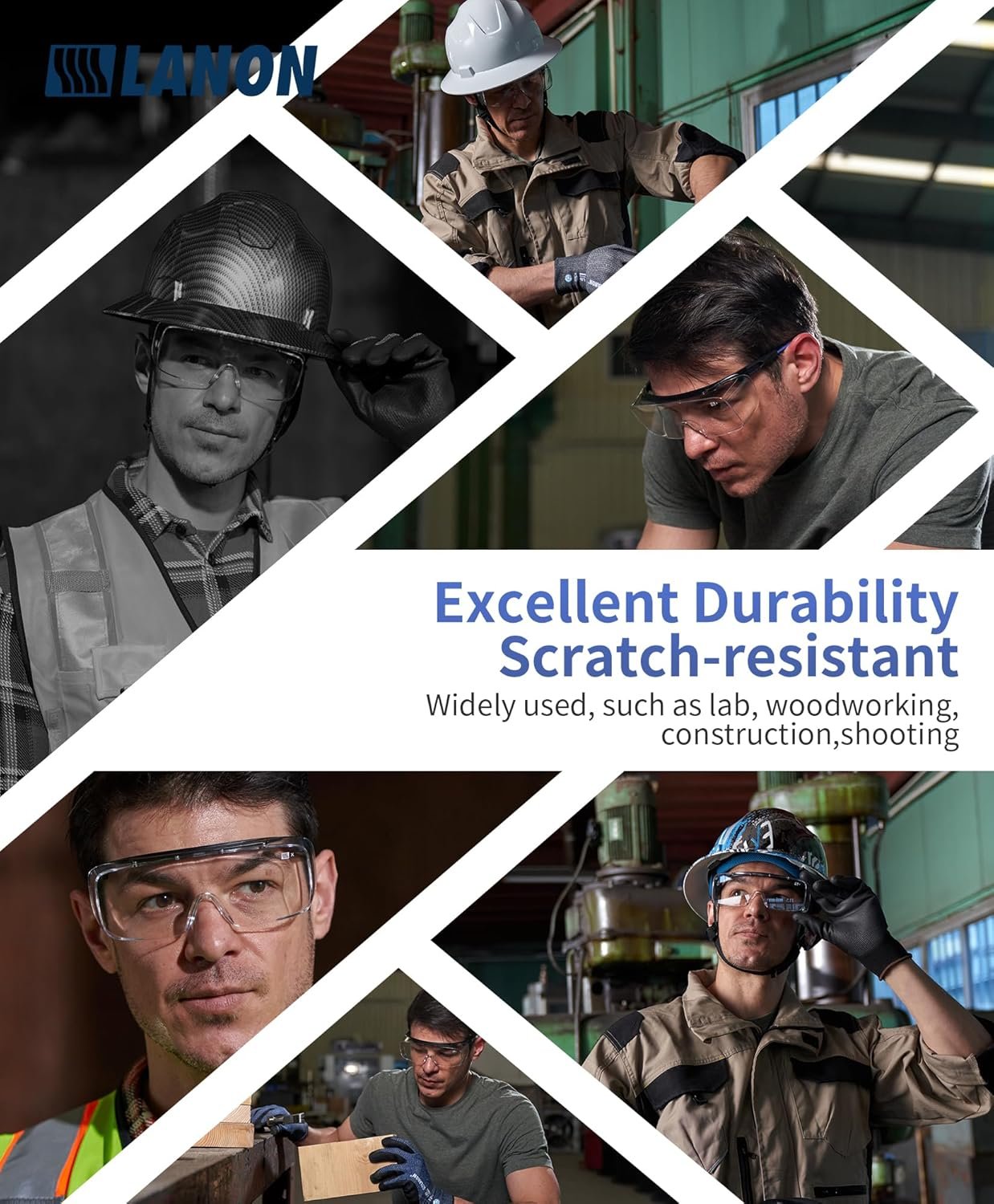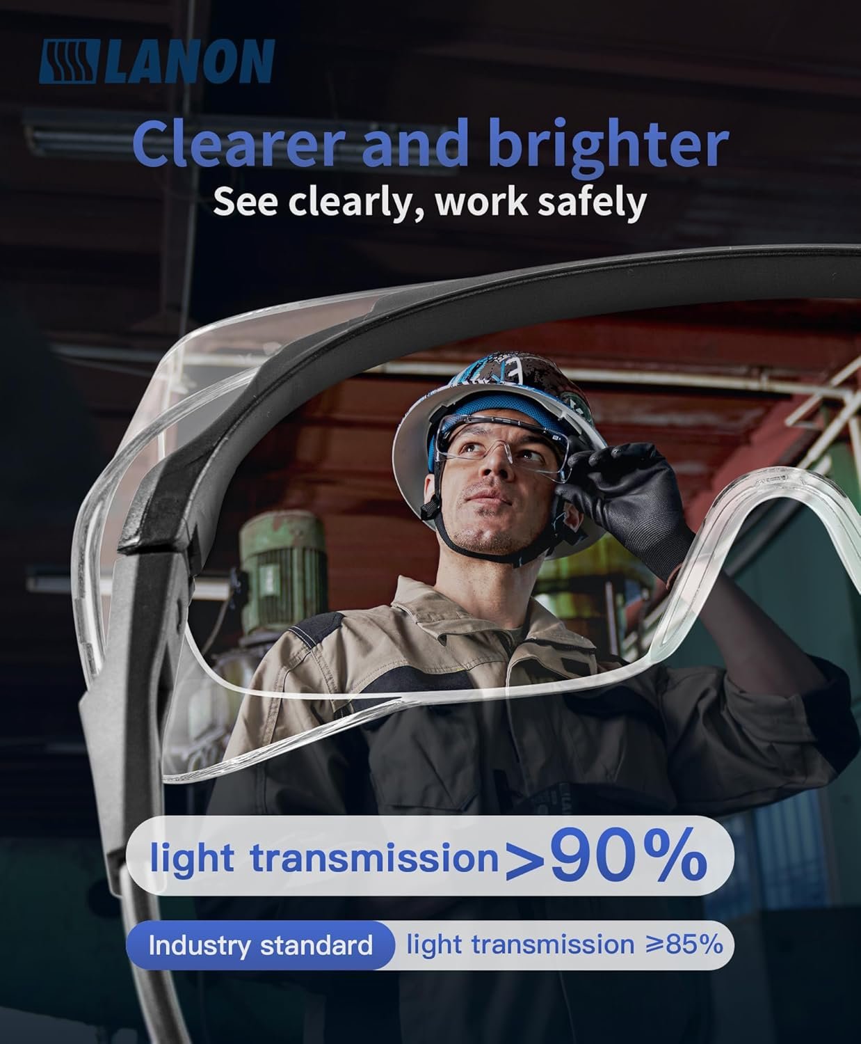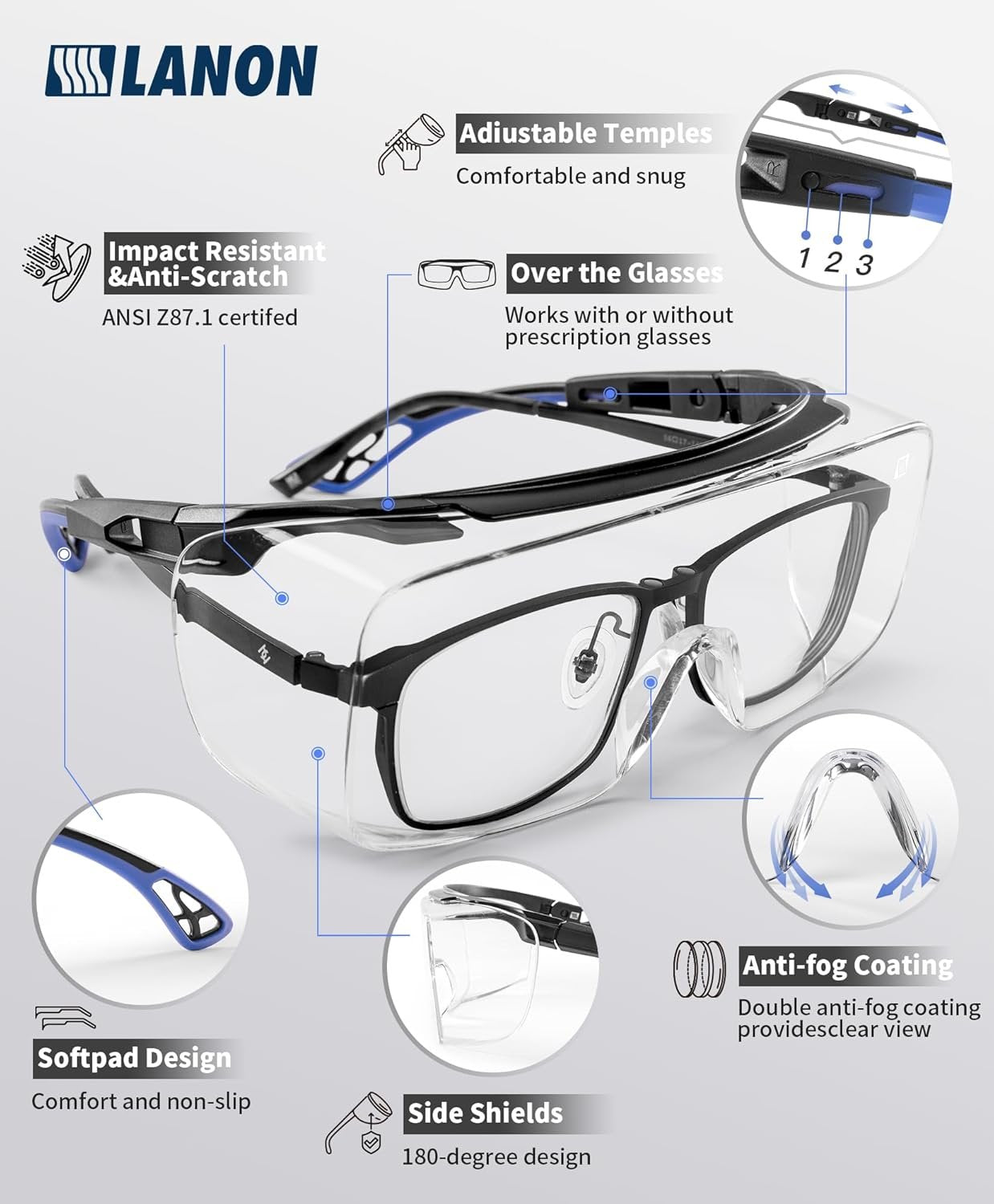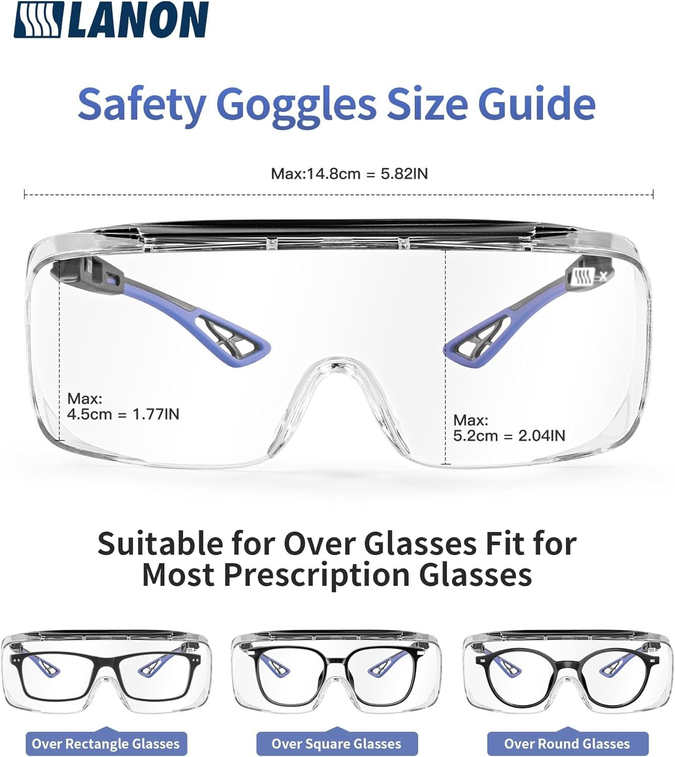 LANON Safety Glasses Over Glasses,ANSI Z87.1 Lenses with Anti-Fog & Scratch,Side Protection, High Transmission, Adjustable Protective Eyewear Goggles