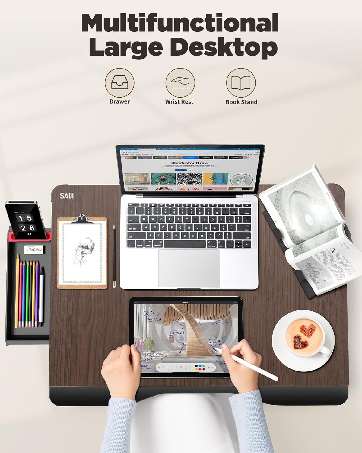 【Extra Large Desktop Size】: Ideal for school college students study, work, play, dorm room essentials SAIJI bed desk tray desktop size is 25.6" x 19.29",fits for laptop up to 17"laptop.Extra lager desktop keep your laptop,textbook,mouse,and smartphone all within easy reach.This desk height 10.6",large space for your legs,easy to flex and stretch your legs for more comfort in bed or couch. 【Super Sturdy】:SAIJI bed tray table is super sturdy,non-slip legs,bear weight up to 40kg,meet your various needs.you can use it on the bed sofa floor for reading, studying, gaming,or use as standing desk for home office,bed tray table for adults, kids eating breakfast. 【Portable and Foldable】: SAIJI foldable laptop table will be a perfect addition to your office or home.It is a portable bed table,folded thickness is only 2",easy to store. It's a great gift idea for family and friend. 【Ergonomic Design】:Streamlined ergonomic design helps Smart & Safe work in the optimum position to support spinal alignment,and the wrist rest design helps to protect your wrist.Ideal college dorm room essentials. 【Accessories Storage】:SAIJI laptop table with storage room for you to store little things,which can be used not only for storing pens,headphones,data cable,charger,make things are easy hand reach.