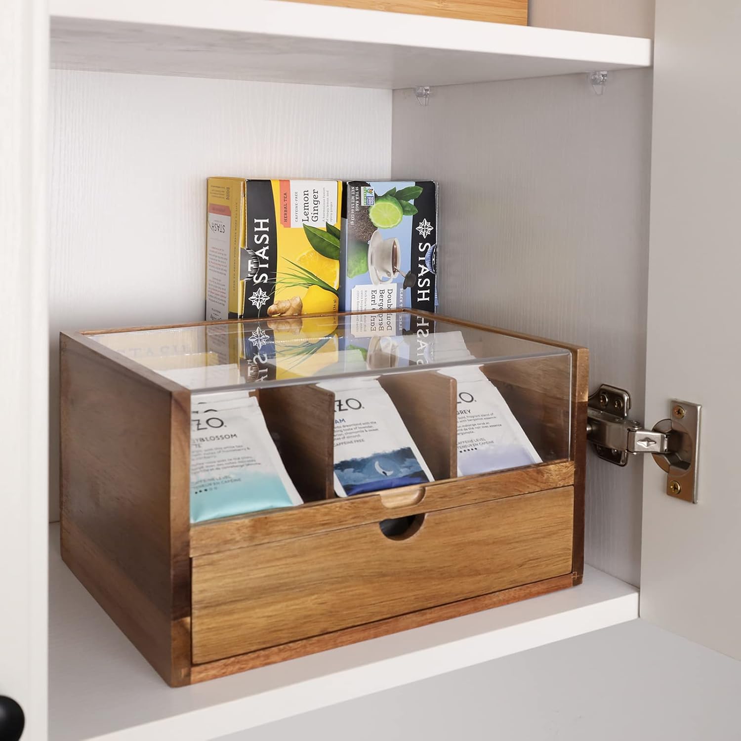 Large Tea Organizer 2 Tier with Drawer by HTB, Tea Bag Organizer with Acrylic Transparent Hinged Lid, 9 Compartments Wooden Tea Bag Holder for Home, Office, Tea Parties
