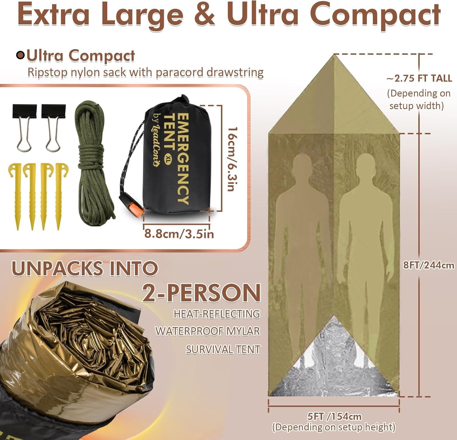 Application - LeadCon Survival Tent is a must-have for every hiker's backpack or car glove box, ready for unforeseen circumstances. Made from stretchable, tear-resistant PE, it reflects up to 90% of your body heat, ensuring warmth and dryness in wet or cold conditions. Upgrade Detail - metal corner grommets and durable plastic tent pegs for added stability. Unlike conventional emergency tents, you won't need to share your space with wet logs or rocks to anchor the corners. Additionally, in harsh weather conditions, the included 2 clips enable you to securely close the tent ends for extra protection against cold and wind. Reliable Materials for Survival Situations - Made of durable and thicker 26um PE material, which is stronger and more flexible than ordinary survival tent. we’ve widening design to protect your body and reinforced tape seams to create a durable, reusable survival tent. equipped with a 120dB Emergency whistle for signaling in case of being lost. Easy to Use - Thread the paracord through the tent; attach each end to a tree; secure the corners with the included pegs. You'll find yourself protected, dry, and warm in no time. Content - 2 sets of extra large survival tents(each include 4 tent stakes,1 x 19.68ft paracord rope and 2 clips); each tent measures about 8ft x 5ft x 2.75ft; and 5 pcs of emergency mylar blankets; each blanket measures 83x51 inches.