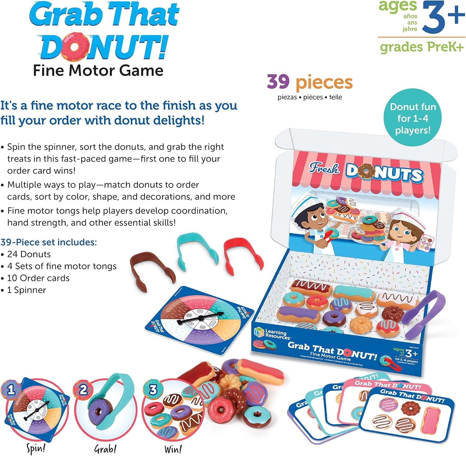 Spin, Grab, and Win!: Spin the spinner, sort the donuts, and grab the right treats in this fast-paced educational game for kids—first to fill their order card wins! New Skills Every Game: In addition to strengthening coordination, hand strength, and other fine motor skills, this preschool game also helps kids learn to sort and match by color, frosting, or decorations! Package With Purpose: The Grab That Donut! Fine Motor Game’s box doubles as both a built-in activity set and a reusable storage solution when playtime’s done! Ages and Skills: Specially designed with little ones in mind, this educational game for kids helps little ones as young as 3 build school-ready fine motor skills! Give the Gift of Learning: Whether you’re shopping for holidays, birthdays, or just because, award-winning educational toys from Learning Resources help you discover new learning fun every time you give a gift!