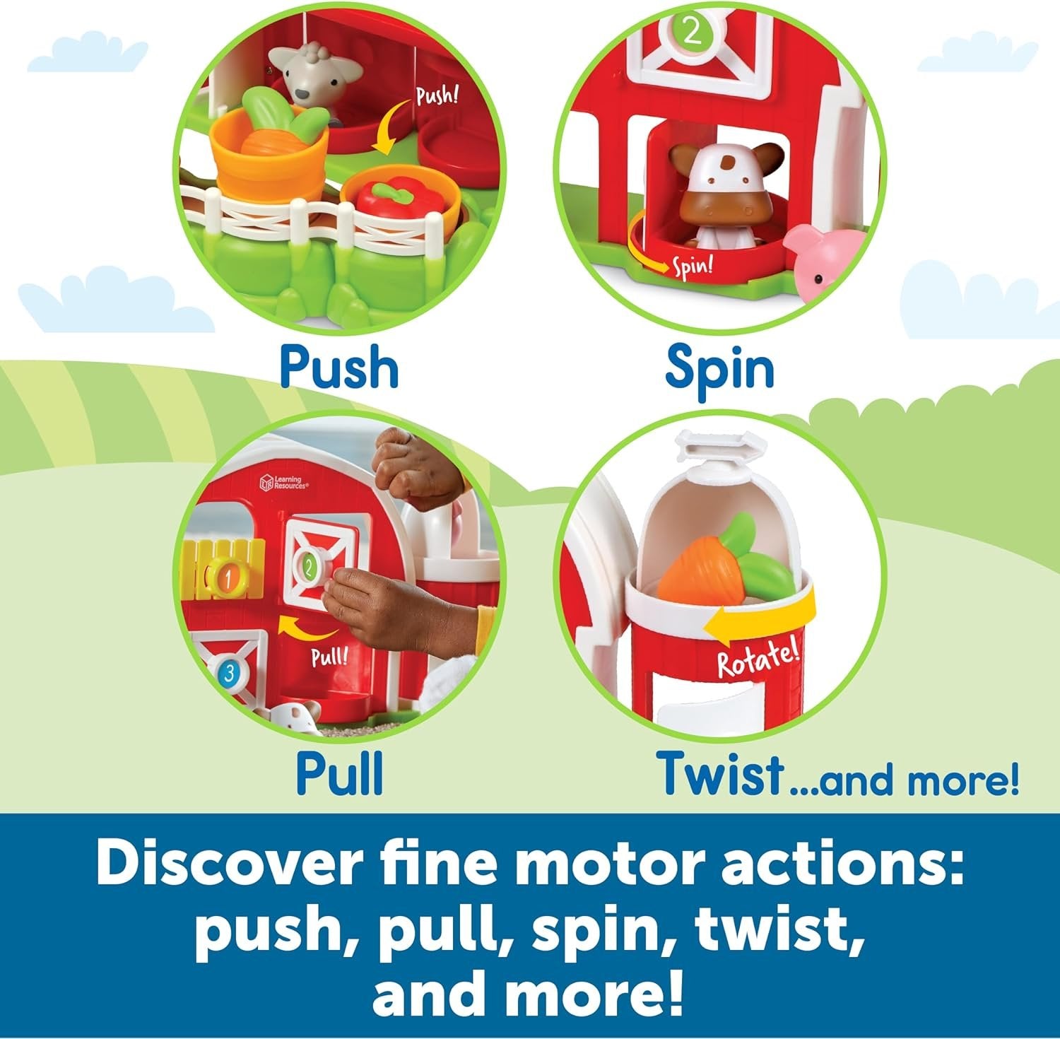 Skill-Building Barnyard Fun!: Kids learn counting, color, and fine motor skills through fun peekaboo play with this preschool learning toy! Fine Motor Down on the Farm!: Discover this toddler learning toy’s fine motor actions—push the basket, pull and spin the doors, rotate the silo, and more! Folds Up for Storage!: When barnyard learning fun is done for the day, this toddler toy folds up small for easy clean-up and storage! Peekaboo Puppets!: This set’s adorable peekaboo farm animals also double as finger puppets for imaginative toddler activities on the farm! Give the Gift of Learning: Whether you’re shopping for holidays, birthdays, or just because, award-winning educational toys from Learning Resources help you discover new learning fun every time you give a gift!