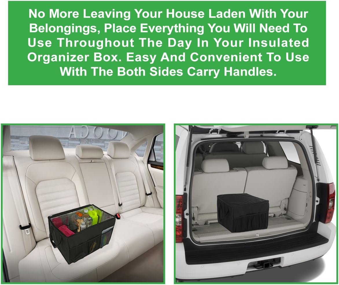 ✓ ★ A MUST HAVE ★ This INSULATED CAR CONSOLE ORGANIZER Is Great To Keep Your Car Organized For An Enjoyable Ride. No More Leaving Your House Laden With Your Belongings, Place Everything You Will Need To Use Throughout The Day In Your Insulated Organizer Box. Easy And Convenient To Use With The Both Sides Carry Handles. ✓ Make Fast Room For Front Seat Passengers While Keeping Driving Necessities Close At Hand And Clutter Under Control. The Car Organizer Is Measuring 18" Long 12" Wide 12" High. It's Made to A Very High Standard, Which Gives This Car Organizer A Good Look And A Super Long Life. When Not In Use The Organizer Will Fold Flat For Easy Storage. ✓ Our Insulated Console Organizer With It's Heavy Insulated Walls Allows This Cooler Tote To Keep Your Freezer And Cooler Items Cold For Hours. It's A Easy To Clean Lining. It Has A Big Storage Section To Keep Your Food Cold Or Warm During Your Trip, It Also Has 3 Outside Mesh Pockets To Store Smaller Items. The Organizer Comes With Top Zippered Cover To Make Sure To Keep Stuff Cold Or Warm. ✓ Our Car Console Organizer Is Designed To Be Used Anywhere In The Car, Outdoor Vacation, Picnics And Grocery Shopping, It's Perfect For The Front Of The Car To Organize Your Driving Necessities Or Bring It To The Back Seat To Store Your Children's Toys, Food and Snacks Within Easy Reach. Can Also Be Great For A Trunk Organizer. ✓ Buy It Now With Confidence, This Best ★ TOP QUALITY CAR CONSOLE ORGANIZER ★ Will Keep Your Car Organized 100% and We Guarantee Satisfaction With a 100% Lifetime Money Back Guarantee.