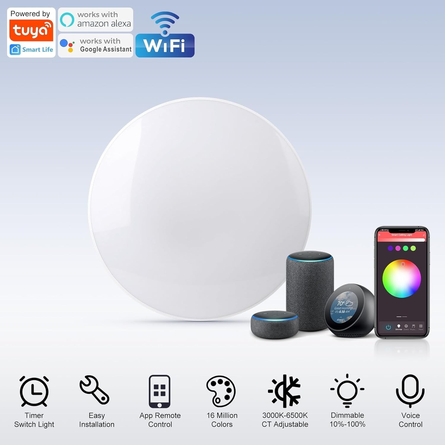ã€Multifunctional Smart RGB Ceiling Light】The RGB smart ceiling light has 160,000 colors to choose from, and th 9W RGB lighting is bright and luminous and stable. Also, it can RGB cycle mode. RGB colors create a very romantic atmosphere, perfect for children's rooms, game rooms, movie rooms and more. 〠Intelligent Control 】 The intelligent Alexa ceiling light can be controlled using wall switches, remote controls, mobile applications (WIFI or Bluetooth), and voice. Compatible with Alexa, Google Assistant, and APP, you can control the ceiling lights, change colors, adjust brightness, change color temperature, turn on/off the ceiling lights, and more through voice control, making life more convenient. ã€Brightness & Color Temperature Adjustable】The colour changing led ceiling light can be adjusted for brightness (10%-100%) and has three light color modes, warm light (3000K), neutral light (4000K) and white light (6500K). You can adjust it according to the needs and mood of use. For example, when you want a relaxing environment, you can turn down the brightness and select the warm light mode. When you are studying or working, you can choose the white light mode. ã€IP44 Waterproof & dustproof】Bathroom ceiling light with sealed design, with IP44 waterproof and dustproof rating, waterproof ceiling light can effectively prevent water splash. You can use it in bathrooms, balconies, and other places that may be subject to water splashing into or more humid. At the same time, the sealed design effectively prevents dust, flying insects and other impurities from entering the lamp, making it safer to use. ã€Timing & Night Light & Memory function】You can use the ceiling light's timer mode before you go to bed and it will automatically turn off after 30 minutes without you having to get out of bed to turn off the light. The night light mode will allow you to have a comfortable bedtime. The memory function will allow the ceiling light to maintain the brightness and color temperature of the last time it was turned off. ã€Energy Saving & Easy to install】Kitchen Ceiling light uses a high-quality LED SMD2835 wick, providing 2520LM light, 24W can replace 200W incandescent lamp, luminous surface is large, more energy efficient. CRI80+, closer to the real color, does not hurt the eyes. The installation of a bedroom ceiling light requires only three steps: 1. fixing the base to the ceiling; 2. connecting the wires; 3. fixing the light body to the base.