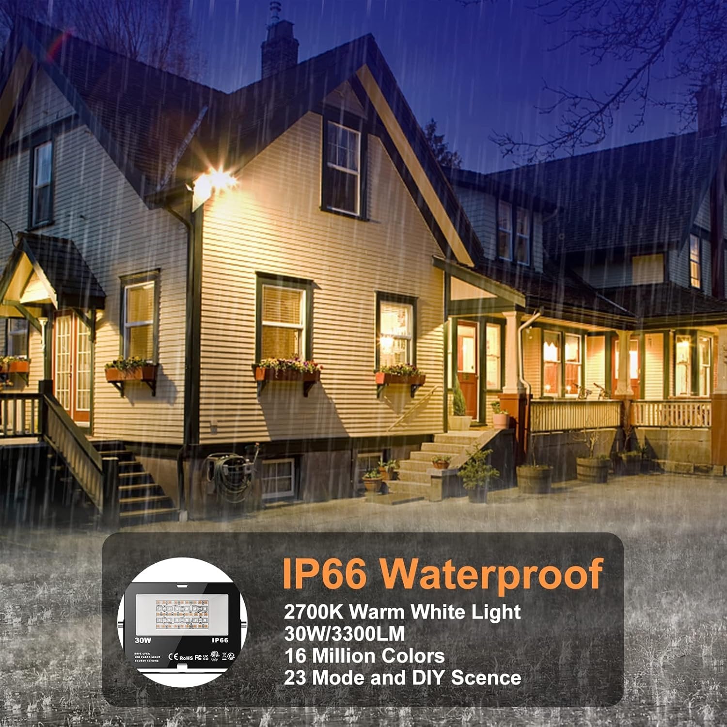 SMART RGBW FLOOD LIGHTING : 30W RGB color changing led flood light use Bluetooth connectivity and APP control,LED stage lights have super bright 2,700K warm white light of 3000 lumens, equivalent 300-watt incandescent lamp,CRI > 85,160 million multicolor RGB static colors and 23 dynamic modes. These outdoor uplights can meet your many needs.Suitable for both indoor/outdoor,daily, mood and decorative lighting.No need wifi,No registration a account nor internet required. NEW TECH: Outdoor LED Flood Lights have equipped with Bluetooth 5.0 chip, Mesh function enabled. Practical user interface allows free control to any number of led floodlights as desired. An excellent solution to multi-light operation, which overcomes the shortcomings of remote control flood lights and WIFI flood lights.When it rains or snows, you can easily control all flood lights outdoor at home. DIY SCENES : You can set the color or mode for each rgb flood light individually, then match it to your favorite scenes (such as party, weding,BBQ, garden landscape, Valentine's Day and other festival decoration etc), save it and activate it with one click at any time. Color Change Sync to Music - Our Smart rgb flood lights can change colors according to rhythm of music melody. You can choose dynamic or soft music according to your preferences. outdoor flood light have 16 million colors and 23 modes, so it can used for stage lights, led up lighting, landscape lighting, tree lights, backdrop lighting,outdoor strobe light, spot light, security light and you can use it to decorate your Christmas, Halloween, weddings party and so on IP66 WATERPROOF : With an IP Rating of 66 and the high quality die-cast aluminum housing and tempered glass material,special technology ensures 100% waterproof,dustproof. the wall washer light could work at the temperature of -30℃ ~ 45℃ and can withstand harsh weather conditions, such as rainstorm, sleet or snow. It’s the great outdoor lighting and the perfect decoration lighting for your garden, yard, aisle, porch, patio, or driveway etc. TIMING FUNCTION: Built-in newly developed timing chip allows you to set your favorite colour or mode to automatically turn on and off on time every day.In addition, it offers a 2-year warranty and a 90-day money back guarantee.High quality standard and friendly customer service. For any issues relating to the product, please do not hesitate to contact us.