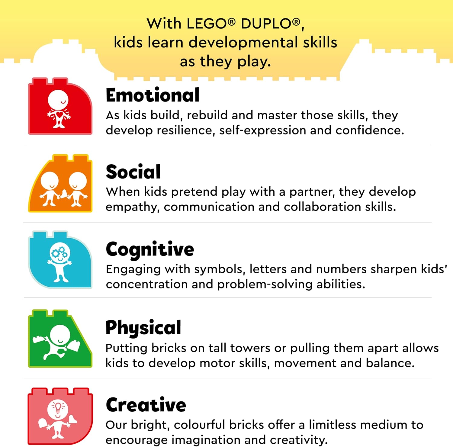 Preschoolers can act out construction site stories with the LEGO DUPLO Truck and Tracked Excavator; as they explore open-ended play, toddlers build developmental skills that last a lifetime This LEGO DUPLO set includes 2 construction worker figures, a push along truck with a tip function, a push along excavator with a rotating digger, and a toy boulder that kids can open up for fun Children develop fine motor and problem-solving skills as they use the construction vehicles, which are the perfect size for little hands; designed to stimulate and inspire creative kids aged 2 and up Families can share developmental milestones as they join in on the imaginative construction site; easy to pick up, clean, and put away, the set is a great birthday, Christmas, or special occasion idea This building site set is packed with features and functions to stimulate and inspire the minds of curious kids aged 2 and up; no batteries needed with the LEGO DUPLO Truck & Tracked Excavator playset Clear instructions help to maximise the fun and the developmental benefits – children are sure to get the most from the versatile playset; LEGO DUPLO playsets are designed to entertain and inspire With familiar scenes, fun characters, and toddler-friendly pieces, young imaginations are encouraged with open-ended play; every little builder’s toy meets the highest global safety standards