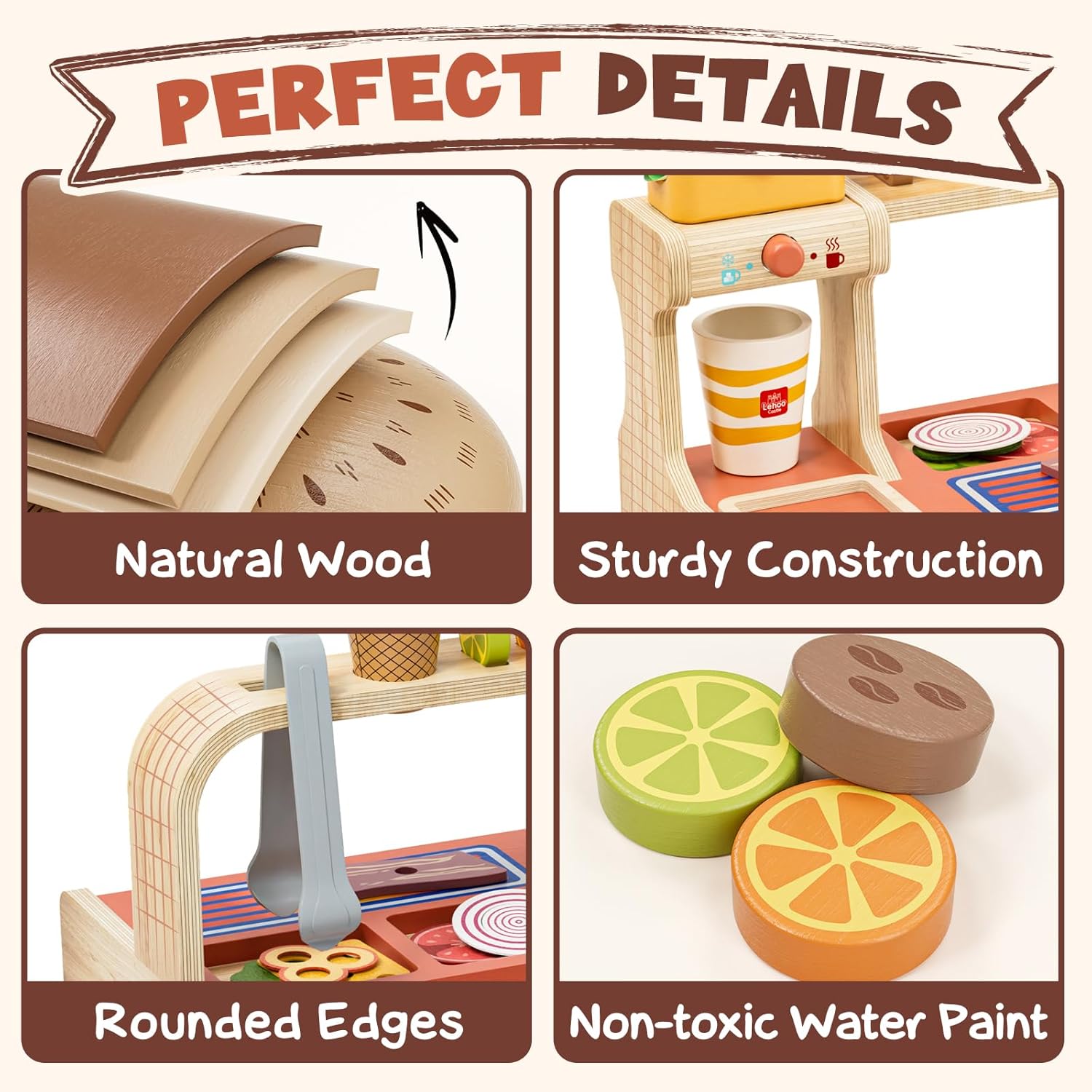 Experience The Fun Of Food Production: wooden burgers, buns, vegetables, sauces, menus and other accessories are available, highly reproducible burger making process, let the child experience the fun of being a little chef and salesman Safety and Environmental Protection: The play food toy use of high-quality wood and environmentally friendly water-based paint, safe and non-toxic, care for children's health, so that parents feel more at ease Exquisite Design, Inspire Unlimited Imagination: This play food toy set has bright colors, realistic shapes, with cute menus and cards, to stimulate children's imagination and creativity, play more tricks Multiplayer Interaction, Promote Parent-Child Bonding: Support multi-player, parents and children can make burgers together, play the role of customers and chefs, promote parent-child bonding, enjoy the fun time Cultivate Hands-on Skills and Improve Social Skills: During play, children can exercise hand-eye coordination and hands-on skills, learn to share and cooperate with others, and improve social skills