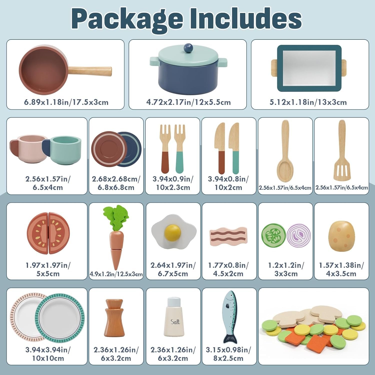 Complete Kitchen Playset: Realistic kitchen toys with 3 cooking utensils: In addition to the common stew pots and frying pans on the market, we also have baking trays, lets kids explore sizzling, baking, and plating—just like grown-ups. Sizes suitable for all types of wooden play kitchen Safe and High-quality: The play kitchen accessories set is made of non-toxic and odorless wood and does not contain lead. All accessories are finely polished, with smooth edges, no splinters, and easy to clean. It is a great choice for parties, gatherings, and parent-child games Cuttable Play Food: This pretend play kitchen toys also has matching plates, tableware, seasonings, and cuttable play vegetables, with Velcro design, which can be used repeatedly, and the experience is better Educational Play: This pretend cooking set sparks creativity and helps kids learn about kitchen tools, colors, and food. It enhances color recognition, hand-eye coordination, and basic cooking skills through fun role play Great Gift Idea: Looking for a fun and educational gift? This kitchen set is perfect for birthdays, Christmas, or any occasion. It’s a great way for kids to play with family and friends and share in the fun