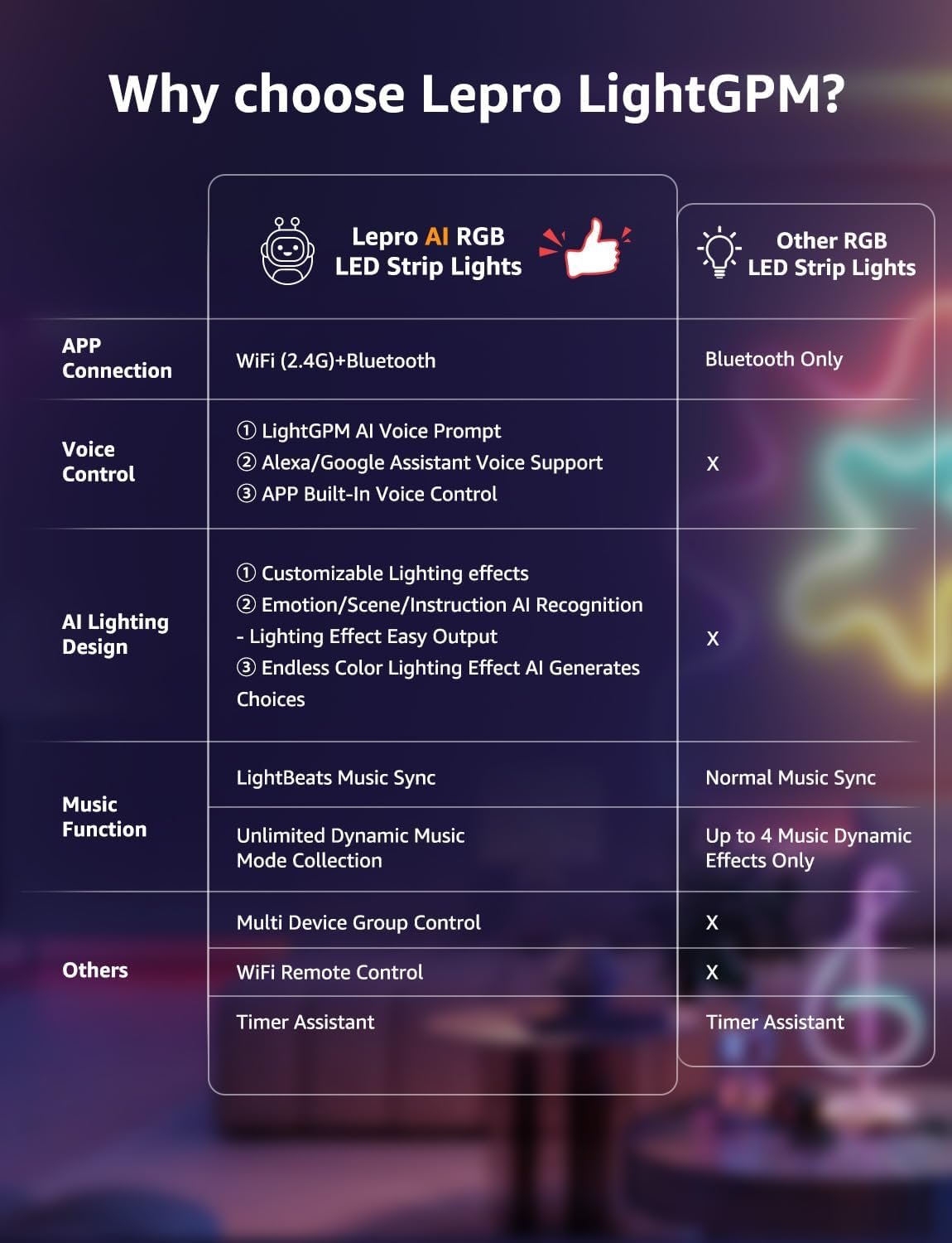 LightGPM AI Lighting Design Assistant-Smarter Lighting Made Easy: Lepro LightGPM is large language model trained by color psychology and lighting design knowledge. Key model architecture is transformer decoder, made professional lighting design easy. Whether you're hosting a holiday party, seeking relaxation, or immersing in the gaming world, each scene is meticulously crafted for a seamless and immersive lighting exclusive experience. Alexa/Google Assistant Compatible LED Lights: Beside APP built-in voice prompt, you can also easy connect with Alexa/Google Assistant to voice control some simple voice command. ( Note: No Remote Control and DO NOT SUPPORT SMART LIFE APP ) Customizable Lighting Effects: Lepro APP newest update provide higher DIY flexibility and intelligent lighting effects, you can customize the color, brightness, and lighting effects of each segment of the neon light strip. Just unleash your inspiration! Big difference from other RGB neon rope light on the market. APP Built-in AI Voice Recognition: Lepro app features an voice assistant, making voice commands a breeze. Even if you don't have Alexa, just in the APP voice prompt to tell your instruction, how your feeling now, what you will do, LightGPM generates up to 10 best lighting effects from billions of trillion potential lighting effect combinations to offer the best professional designs, or easy adjust brightness, change colors, and control lights for you. LightBeats Music Sync: Experience dynamic lighting that syncs with music rhythms, transforming any space into an energetic and mesmerizing environment for parties or dancing.Pick up music from your phone's mic. Please keep the sync page open and the screen on. Seamless Group Control, Anywhere: Manage multiple devices effortlessly with "Lepro" App. Whether you're at home or on the go, you can effortlessly turn light strip on/off, set timers, adjust brightness, change color temperatures, and more. As long as your led light strips are connected to 2.4GWi-Fi.
