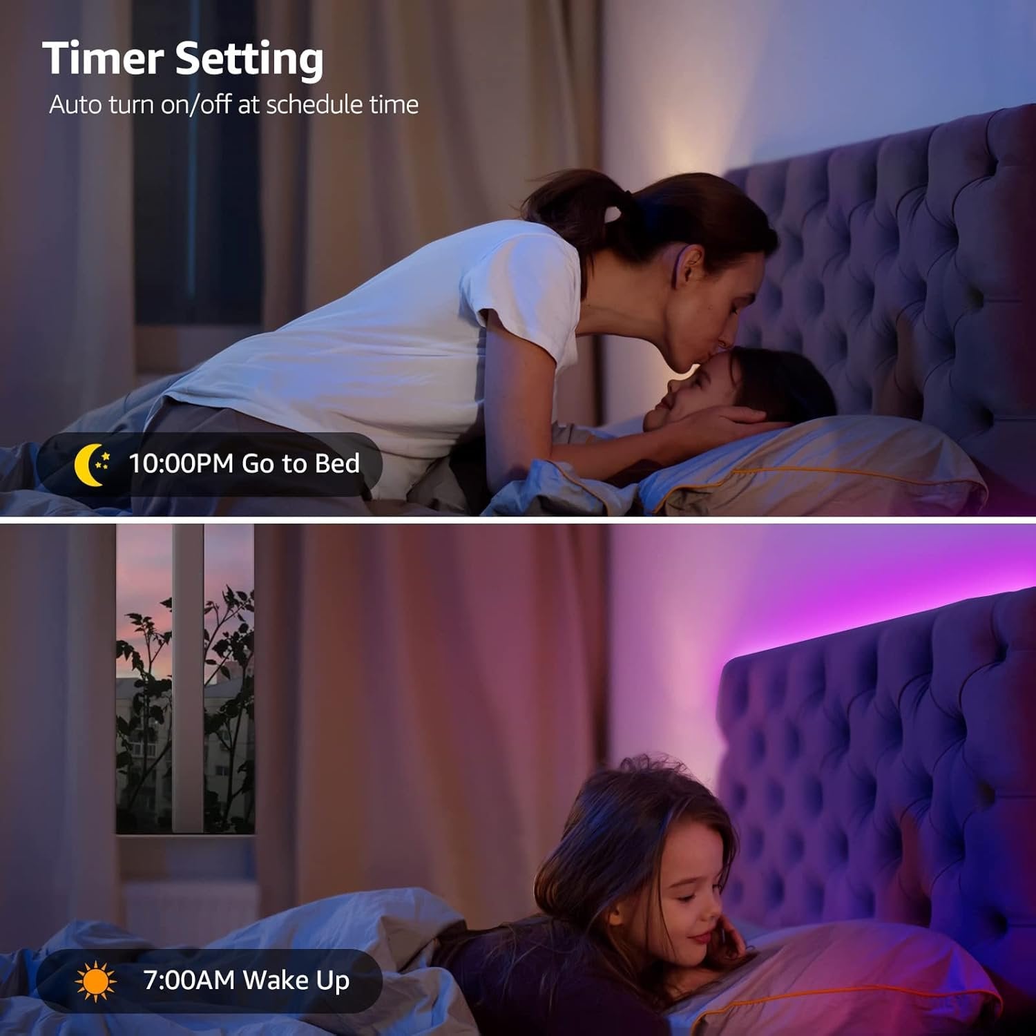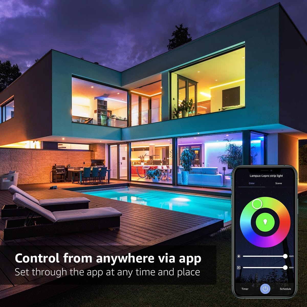 4 Easy Control Ways: Works with Alexa and Google assistant, search the free app "smart life" to app control, hands free easy change your light colors, turn on, turn off lighting by your voice command, also can be controlled by App/remote control (package included remote control). Besides can use mini box control adjusting the brightness or colors according to your desire, enjoy your handy life! Music Sync Mode: There is a built-in microphone smart led strip light, thus the alexa led strip lights could sync with any music coming out of any other speaker in room. It could also dance along with beats of music (or even hands claps). First choice to fire up a party enjoy lights dance to your favorite songs. Set Timer & Assistant: Easily turn off your home smart tape led lights that works with Alexa when you forget it or turn on it when you are not at home by the APP. Besides, it can also turn on/off the smart wifi led lights or trigger a programmed scene at your preset time. Add schedule, this wireless led light strip will be your good assistant. 16 Million Colors & Dimmable: Accompanying with more than 16 millions of colors and dimmable brightness, you can change the colors and the brightness and modes of led wifi rgb strip lights just as you like. The brightness can be adjusted from 1% to 100%. Easy to Set up DIY Your Room: An strong double-sided adhesive and added screws and fixing clips make this led lights strip for bedroom stuck to the surface firmly. Also, this smart light strip can become your desired length and shapes if you are interested in DIY. Please note that when you cut the extra strip, the rest is useless.