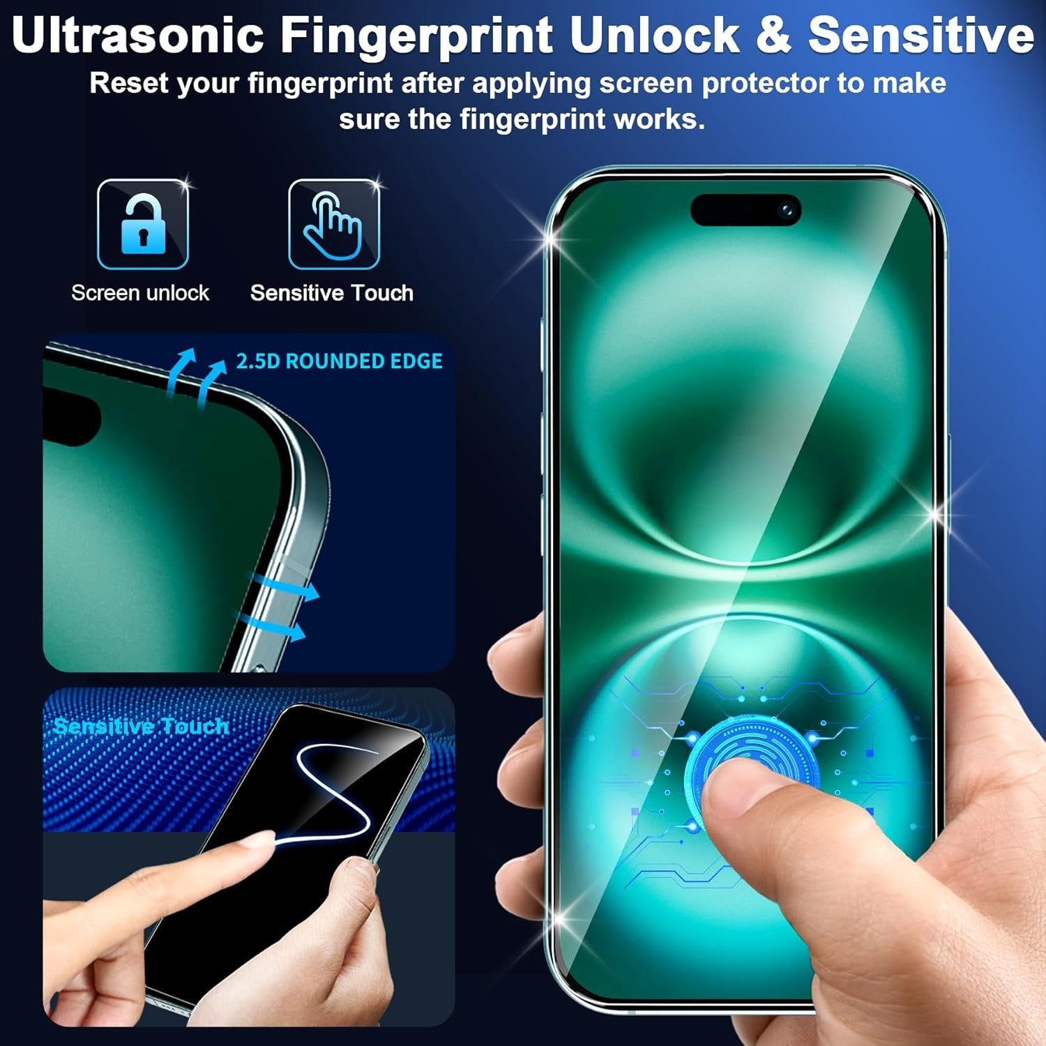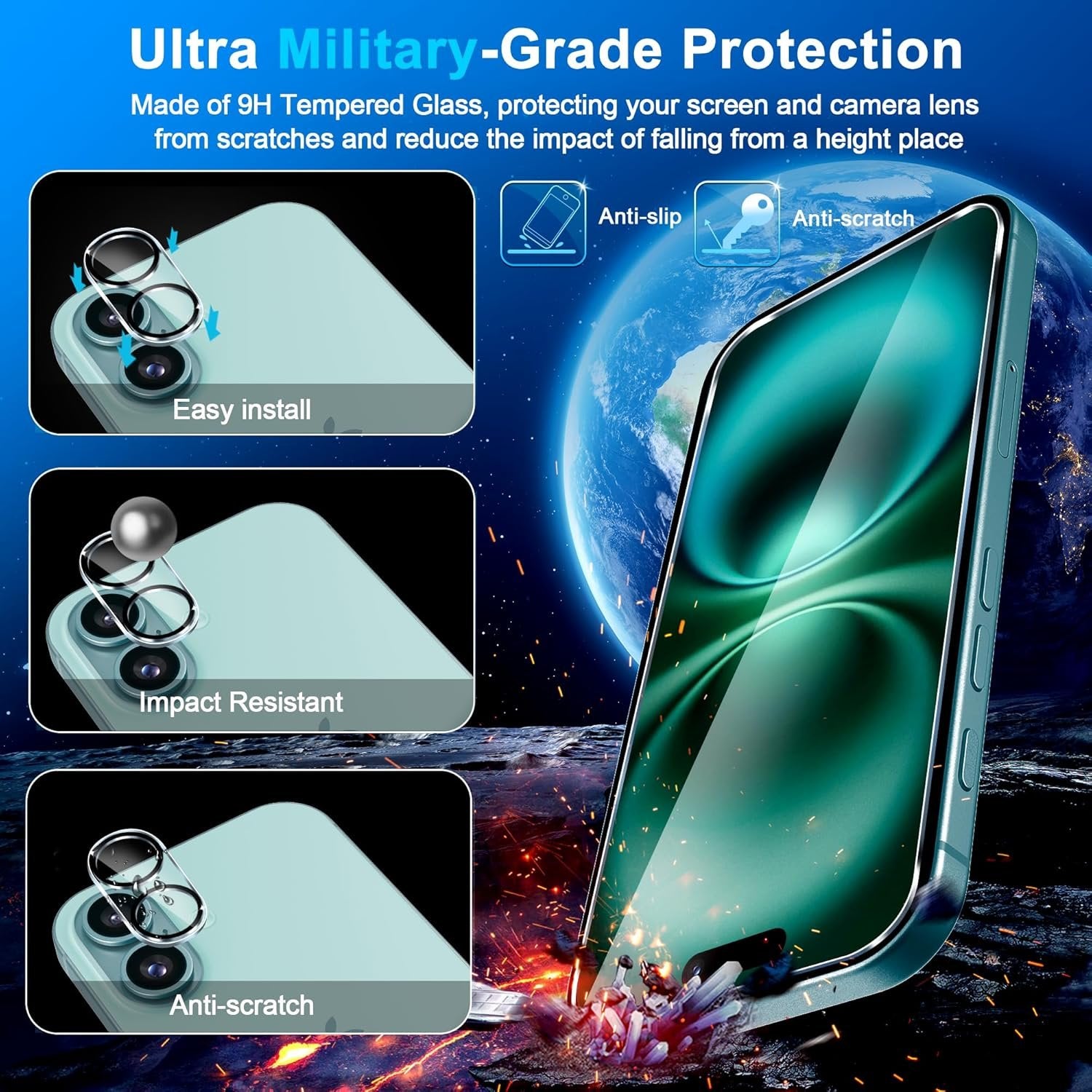 【Face Recognition & Ultra Clear & Touch Sensitivity】 High-response Haptic Touch Technology gives a "True Touch" feel, 99% HD Clear screen protector with High definition transparency film and maximum resolution which keeps the bright and colorful image quality. for Face Recognition 【9H hardness& 3X Stronger Scratch resistant】Upgrade 10X Military Shockproof with edge strengthening design, Highly durable Resistant Tempered Glass can Effectively Protect Your iPhone from Unwanted Scuffs and Scratches by Keys and Some Other Hard Substances. 【6 Pack】3 Pack Screen Protectors+3 Pack Camera Lens Protector are both made of High-quality Tempered Glass for iPhone 16(6.1") 【Case Friendly & Does not fall off】It is 100% brand new, Precise laser cut Full Glue Sticky tempered glass and will not fall off, exquisitely polished, 2.5D rounded edges technique makes curved edges of the film to perfectly fit curved corners and edges of the phone, 1.3 mm margin around the edge of the device to be for MOST cases 【Camera Lens Protector Double Protection】Nano electrostatic automatic adsorption technology, easy installation and not easy to fall off, without any bubbles or white edges. Up to 9H hardness tempered glass, can protect the camera from scratches, shatterproof and high-impact drops. Anti-fingerprint coating to keep it clean, the light transmittance of 99.99%, NIGHT SHOOTING FUNCTION Transparent lens film keeps your phone and phone photos' original color all the time 【Easy Installation with Mounting Frame & Without bubble & Oleophobic Nano Coating】:It adopts premium quality AGC glass materials, thus creating an oil-resistant, anti-fingerprint, scratch-resistant surface that is easier to clean and protect against sweat effectively, and enhance the visibility of the screen. Bubble Free Guaranteed. A installation frame that makes it very easy to align film with phone screen, One-touch ultra-light automatic adsorption installation, no foam at all