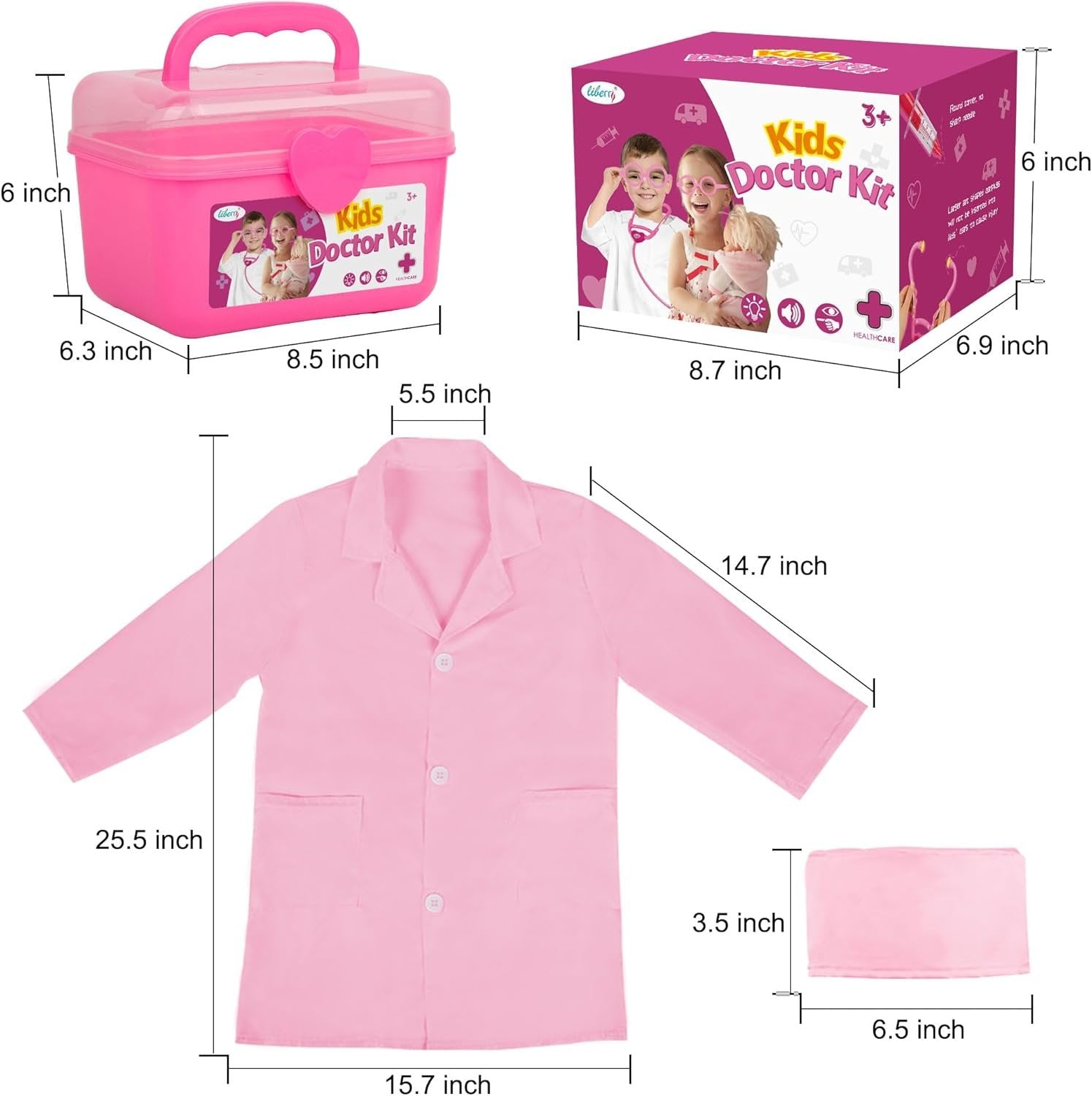 【SAFE AND DURABLE KIDS DOCTOR KIT】These tools are designed for little hands and easy to grasp. They are all made of durable ABS plastic materials, which are non-toxic, BPA-free and odor-free. There are no sharp objects or edges of these tools, so you don’t have to worry about kids hurting themselves while they play 【REALISTIC SOUND AND LIGHT EFFECTS】When kids press the electronic stethoscope, they can hear the heartbeat sound; the sphygmomanometer can be worn on kids’ wrist, the air valve ball is squeezable and the indicator of gauge will rotate when child press it; the thermometer, otoscope, flashlinght and dental mirror can all emit light when working, which can give children a more real experience while playing. Batteries are included for your convenience 【EDUCATIONAL DOCTOR PLAYSET FOR KIDS】The doctor pretend play can not only stimulate kids’ imagination and creativity, but also cultivate their compassion and foster their social skills. Kids can also comprehend the uses of different medical tools and know different body parts. Being a little doctor helps relieve children’s anxiety and alleviate their fear of going to the doctor 【EASY TO STORE AND CARRY】The sturdy, spacious storage box measures 8.5''L X 6.3''W X 6.l''H. It is very convenient for both home storage and travel. The carrying case is big enough to hold all kids doctor playset. Your room will no longer be in a mess with it, and meanwhile, it can cultivate children’s awareness of storing toys. The snap-lock latches keep the case securely closed, and it is easy for children to manipulate 【IDEAL GIFT FOR TODDLERS】Liberry doctor kit for kids is a great gift for any occasion, such as party, pretend game, role play, class reward, holiday toy gift, Christmas gift and birthday gift. By playing with our doctor kit for toddlers, it can help your child learn more about doctors and help them reduce their fear of going to the doctor