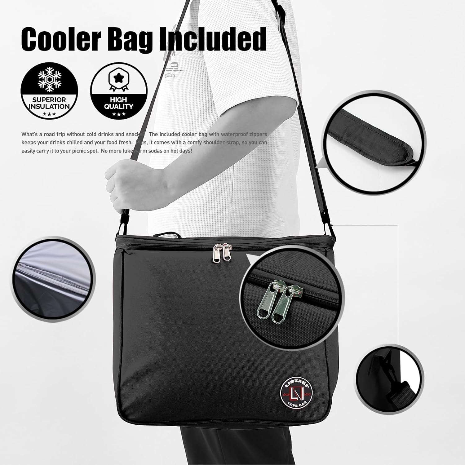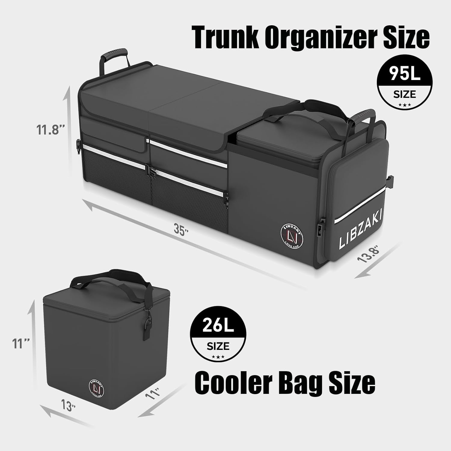 Ultra-large Capacity: When fully unfolded, the LIBZAKI Trunk Organizer measures 35" x 13.8" x 11.8" (L x W x H) with a capacity of 95L. It fits cars, trucks, jeeps, and minivans, keeping your vehicle clean and organized. Perfect for shopping, camping, or home storage, it meets all your travel and storage needs. Fine Quality Material: Constructed with premium thicker cardboard and 600D dense Oxford cloth, this car storage bin is wear-resistant, stain-resistant, waterproof, and odorless. Reinforced with thick partitions and featuring excellent sewing, it offers superior stability and can bear up to 30kg (66 lbs), ensuring durability. High Usability: The Cargo Organizer Trunk includes numerous partitions to hold groceries, tools, cables, and work materials. It can be configured as one or two boxes or folded flat when not in use. With a large pocket on the right, five side pockets, and two mesh pockets, it provides easy access to items. Reflective strips on the front and side offer added safety as emergency warnings. Detachable Ice Bag: The trunk organizer includes a detachable ice bag, which can be carried on the back or shoulder. It keeps food warm or cold for 8-24 hours with its waterproof zipper and high-quality interior. Ideal for kayaking, beach trips, and camping, it keeps ice and drinks cool for a refreshing trip. Innovative Design: LIBZAKI prioritizes customer experience with a unique storage bin designed to meet personalized needs. Available in vibrant black, gray, pink, rose red, and blue, it makes an excellent gift for relatives and friends.