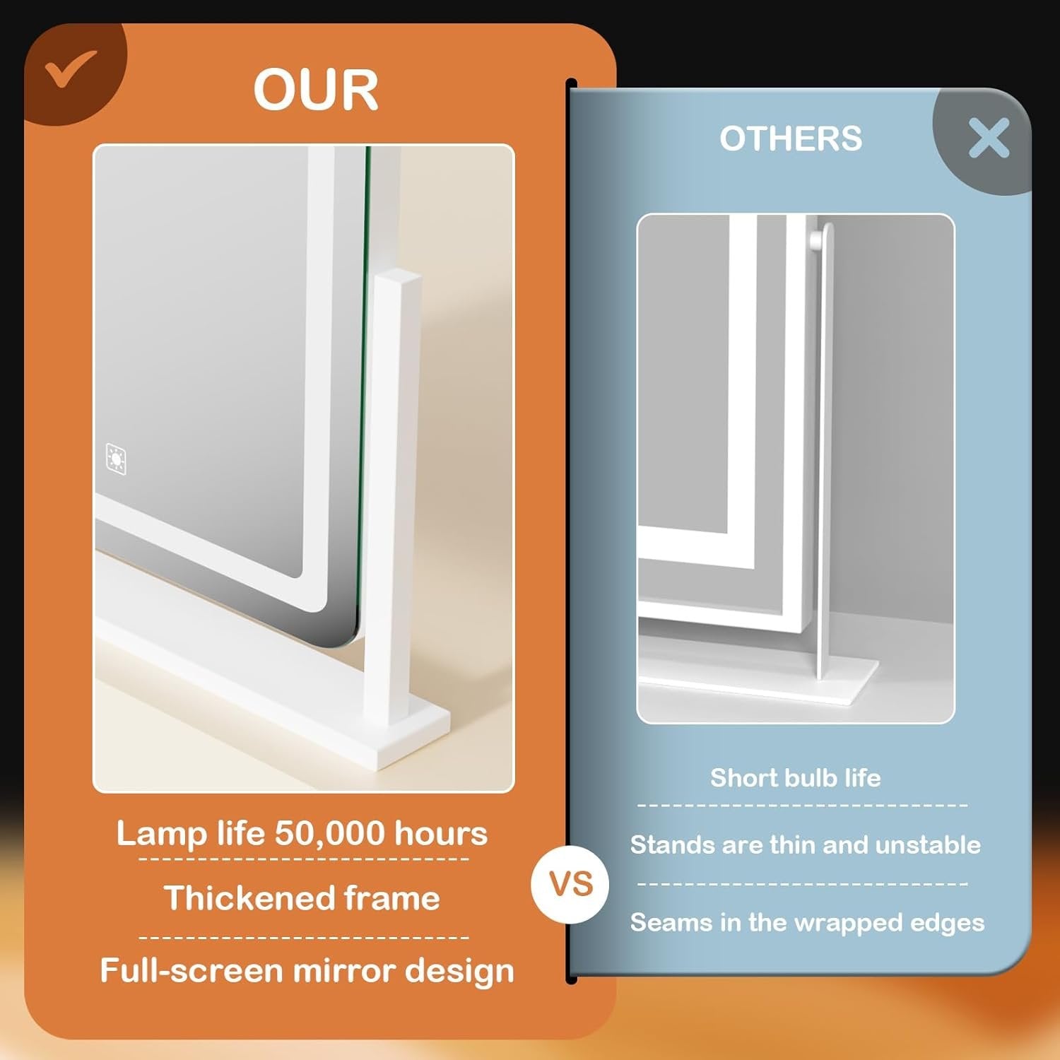👍【Upgrade brightness】Most of the makeup mirrors with light bars on the market only have 120 light beads, which makes consumers feel that the lighting is not enough. We have improved on this! We have a full 180 light beads light bar per meter,which greatly improving the brightness of the makeup mirror. 👍【Smart Touch Control & Memory Function】Gvnkvn lighted smart mirror with lights has 3 touch buttons on the front. Simply "short press" to change the color temperature, "long press" to adjust the brightness. The built-in Memory Function can help remember your personal brightness settings, thusit will get in to the same light mode when you turn on the mirror next time. 👍【Perfect size professional mirror】dressing mirror large size: 17.2 "L x 13 "W, providing you with the perfect perspective; frame using strong aluminum alloy .of copper-free silver-plated glass, even if the glass is broken, it can maintain the bonding state without causing damage 👍【Detachable 5X Magnification mirror】detachable 10X Magnification mirror helps you to see every detail clearly and apply delicate makeup for eyeliner, eyebrow and lipstick. 【NOTICE】Magnifying not the entire mirror,it is 4 inch detachable 5X Magnification 👍【No Installation Required】The make up mirror doesn't require any complicated installation, all you do is plug the mirror in, and it’s working.