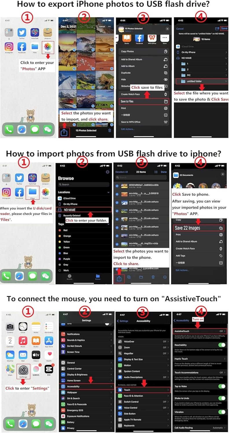 【Easy sharing:】 Using iPhone to USB camera adapter, you can connect the camera and immediately import the beautiful scenery captured by the camera to your iPhone to share with your family and friends, or you can transfer files from a USB flash drive or memory card to your iPhone /iPad, expand your phone memory. 【Stunning features:】 USB Female adapter Supports connection of USB flash drive, USB mouse, keyboard, MIDI keyboard, electric piano, drums, mixer and other devices. This iPhone USB adapter is the best choice to extend more functions to your phone or tablet. 【Strong Compatibility:】USB to iPad adapter is compatible with iPhone, compatible with iPad Pro/iPad Air/iPad mini, iPhone 14/13/12/11 series, 8/7 series, X series/SE series. Support photo format JPG/RAW, video format H.264 and MPEG-4. USB flash drive must be FAT32 or exFAT. NTFS is not supported, this product cannot power the device. 【Small and portable:】This iOS OTG adapter has a short cable, is light and durable, weighs only 10g, and is 4.7 inches in length. The aluminum shell helps dissipate heat faster. It is very suitable for traveling or working in a bag. 【Notes:】 ● Support iOS 13 and above; ● The maximum current of USB peripherals does not exceed 200 mA; ● External hard drives/printers are not allowed; ● The aluminum case heats up a little when used for heat dissipation.