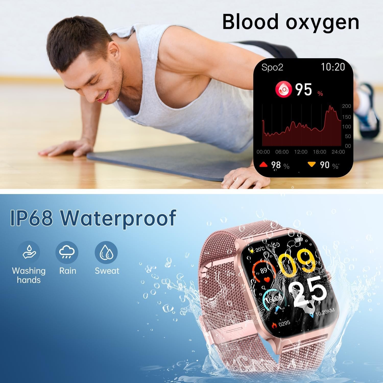 - - - - mens watch womens watch for men women watch Smart watch with text and call: ios android smart watch is equipped with a clear speaker,pedometer watch can directly use womens mens watch to answer make calls/read messages/play music/store contacts.You can get notifications of calls, SMS and SNS messages, Whatsapp, text, facebook etc.Fitness tracker watch for women men can support most android and iOS phone(andriod 5.0 and above iOS 9.0 and above).Such as compatible with iPhone, Samsung, HUAWEI,etc Intelligentdigital Screen Smartwatch: Digital watch women men adopts a larger screen design,The comfortable and soft strap is suitable for different groups of people and is also suitable for daily life matching. It is an important fashion trend item.Smart watch for android phones contains many dials readily available to choose from along.You can DIY watch faces with your own photos.Smart watch for iphone compatible can be any photo,such as your family,pet,et Fitness watches for women men & 112 Sport Mode - Sports watch accurate track step,distance,calorie.Digital watch men women support 112 sport mode:running,riding,badminton,hiking etc to give you more detailed insight into whole day activity.Step tracker watch for women men is IPX8 waterproof,you can wear it during outdoor activities, rainy day, washing hand.Note: This step counter watch can obtain GPS positioning through your mobile phone and clearly upload your movement path Activity trackers and smartwatches wih multifunction - Our rose gold waterproof watch has many features like camera control,music playback/control,weather information,alarm,stopwatch,timer,sedentary reminder etc.ios android smartwatch for men women equipped with large capacity long battery life and can be used 7-15 day.Watch screen will light up every time you raise your hand.ios android watch for men women help you exercise scientifically
