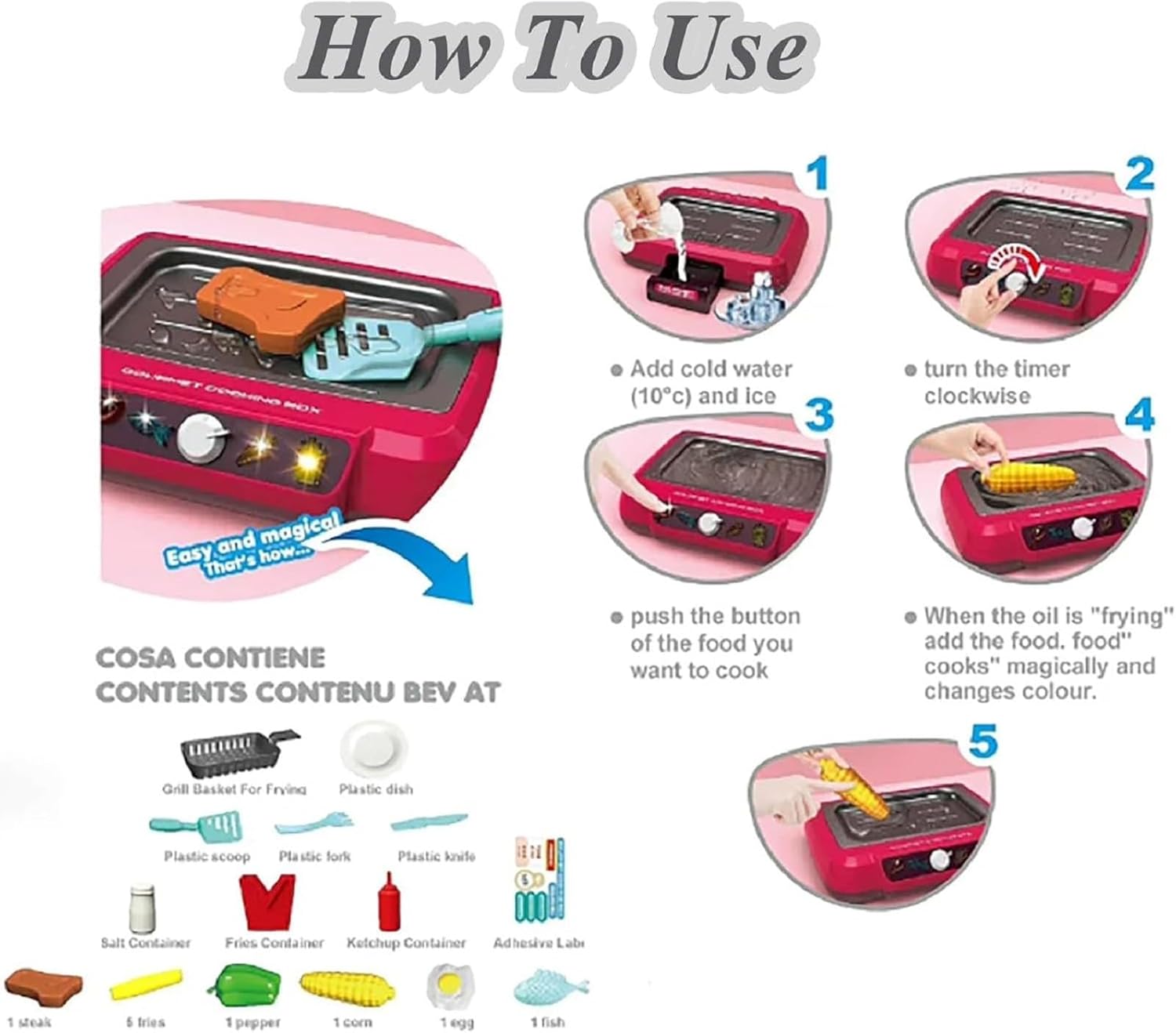 【 Regali】The is the for children. I bambini possono giocare in esperienze immersive con amici o familiari e effetti realistici. Necessita di 4 batterie AA (non incluse/si prega di utilizzare batterie di marca, batterie di marca e batterie ricaricabili non consigliate) 【Pretend Play Gourmet Cooking Box For Kids】This simulation Cooking Toy Can Attract The Child's Attention. È un fantastico strumento educativo per i bambini per imparare a conoscere vari e sviluppare le loro abilità pratiche, la coordinazione delle mani e la creatività durante la cottura. 【Gourmet Cooking Box Toy】 Let's Pretend To Use The Fry To Prepare! Al momento della frittura dopo aver aggiunto acqua fredda e ghiaccio, il pulsante per te vuole "cucinare" come Mettete il vostro pretendente nel fryer, pesce vegetale, fregio e guarda come magicamente cambiano colore come "cucina"! Gli appears To Be Cooking Because Of The Color-changing Feature. 【Unleash Your Imagination】 Dai cucini in miniatura con il trucco e i piatti per captivating dress-up che trasforma ogni giorno momenti in avventure straordinarie, questi giocattoli Pretend Play sono qui per creare una creatività scintillante. Let Your Imagination Run Wild As You Step Into The Shoes Of Your Favorite And Invent New Stories With Every Play Session.