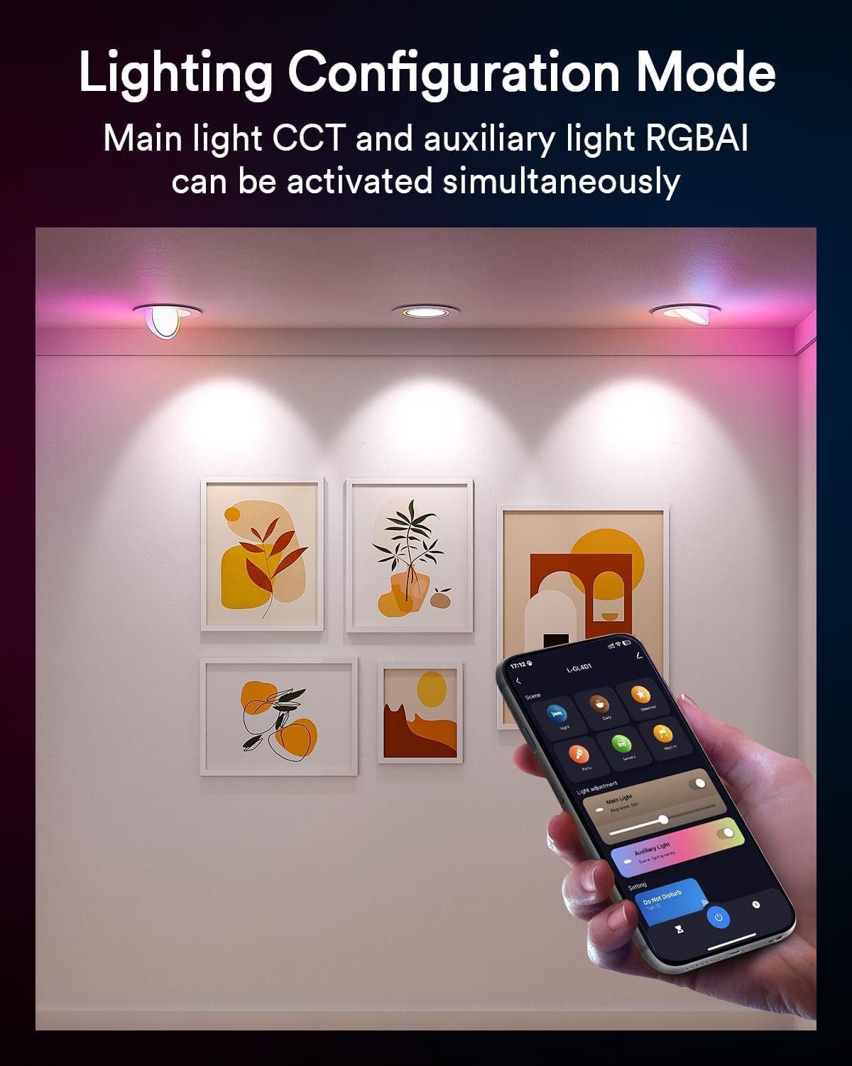 【270°+ 90° Adjustment】Lumary 4 Inch gimbal led recessed light rotates 270° and tilts 90°, ideal for highlighting art and focused lighting. The main light features a 100° beam angle that highlights art details, excellent for galleries, collections, and displays. It also works well in tricky spots like soffit, vaulted, sloped ceilings, vaulted attic ceilings, and cathedral ceilings 【Signal Boost & Easy Installation】 Lumary smart gimbal recessed light 4 inch have a separate control box for better signal. The Lumary app connects via Wi-Fi and Bluetooth in under a minute, with installation or removal taking just 10 seconds 【Auxiliary Light Dynamic RGBAI】Lumary's RGBAI technology offers 16 million colors. The smart gimbal auxiliary light, with 12 controllable segments, provides endless DIY design options and stunning effects. With Lumary RGBAI Gimbal Smart Recessed Lighting, explore new ways to light your home. (𝐓𝐡𝐞 𝐂𝐂𝐓 𝐦𝐚𝐢𝐧 𝐥𝐢𝐠𝐡𝐭 𝐚𝐧𝐝 𝐑𝐆𝐁𝐀𝐈 𝐚𝐮𝐱𝐢𝐥𝐢𝐚𝐫𝐲 𝐥𝐢𝐠𝐡𝐭𝐬 𝐰𝐨𝐫𝐤 𝐬𝐞𝐩𝐚𝐫𝐚𝐭𝐞𝐥𝐲 𝐨𝐫 𝐭𝐨𝐠𝐞𝐭𝐡𝐞𝐫.) 【Music Rhythm Mode】Lumary gimbal smart ceiling light sync with your music's rhythm, enhancing gatherings with dynamic lighting. Experience recessed lights pulsating to fast beats or softly glowing to slow melodies at parties, creating a magical ambiance for special occasions 【Voice/APP Control】Lumary smart gimbal recessed lights work with Alexa and Google Assistant for voice control or via the Lumary app. Adjust colors, brightness, scenes, timers, and group controls effortlessly with smart technology. (𝐍𝐨𝐭𝐞: 𝐎𝐧𝐥𝐲 𝐬𝐮𝐩𝐩𝐨𝐫𝐭𝐬 𝟐.𝟒𝐆𝐇𝐳 𝐖𝐢𝐅𝐢, 𝐍𝐨𝐭 𝐜𝐨𝐦𝐩𝐚𝐭𝐢𝐛𝐥𝐞 𝐰𝐢𝐭𝐡 𝐭𝐨𝐮𝐜𝐡 𝐃𝐢𝐦𝐦𝐞𝐫 𝐒𝐰𝐢𝐭𝐜𝐡𝐞𝐬)