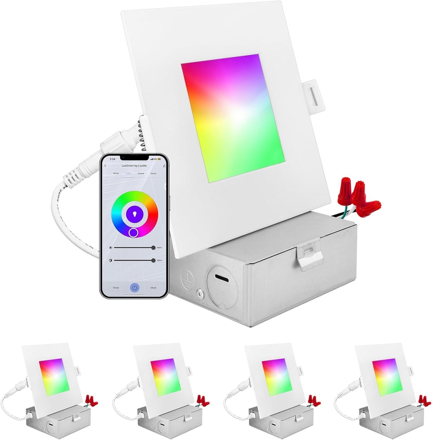 LUXRITE 4 Inch Square Smart LED Recessed Lighting, RGBW Color Changing, WiFi App Control, Voice Control with Alexa and Google Home, No Hub Required, 10.5W 700LM, CRI 90, IC Rated, Wet Rated (4 Pack)