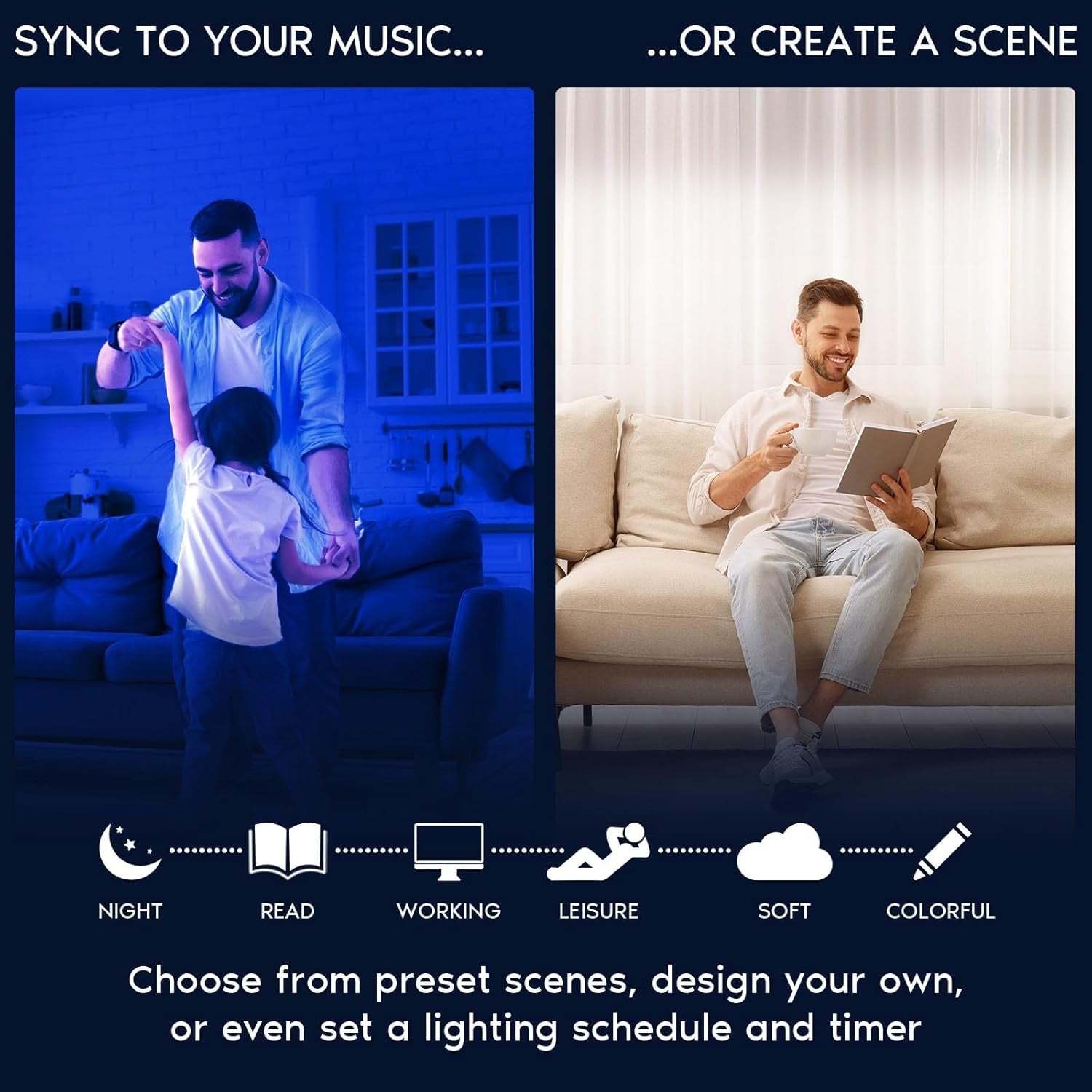 RGBW ADJUSTABLE - Immerse yourself in a world of captivating colors with smart recessed lighting that has a stunning range of 16 million colors and tunable white light between 2000K-5000K. Adjust the hue of these RGB lights for a personalized touch when you are watching movies, playing games, hanging out with friends, or just relaxing at home. You can even dim down to your preferred setting when you need to give your eyes a rest. Be in control of your home from anywhere with these smart lights. APP CONTROL - With 2.4GHz WiFi connectivity, everything is at your fingertips. Effortlessly control your lights from anywhere using the SmartLife phone app through android or iphone. Set personalized scenes that match your mood or activities and create timers and schedules to automate your lighting, ensuring convenience and energy efficiency. Make groups to control your lights all together or separately depending on room or preference. No hub is required, simplifying the setup process. MUSIC SYNC - Amplify your music's impact and watch as your lights dance in a symphony of sound and light. Whether you're hosting a party or simply enjoying a personal jam session, the synchronized hue slim downlight bring a layer of excitement and emotion to the music. Feel every beat and pulse as the lights intensify the atmosphere and transport you to a new level of musical sensation. Let the magic of light and sound synchronization sweep you away into a world where music truly comes alive. RELIABLE LIGHTING - Enjoy a smart ceiling light that gives you a customizable experience anywhere in your home, whether indoor or outdoor. Each 4 inch led recessed lights color changing fixture is RGBW tunable with 16 million colors and 2000K to 5000K adjustable, app controlled, voice controlled with Alexa and Google Home, dimmable via app, 50,000 hour lifetime, CRI 90, IC rated, Wet Rated, Energy Star and etl Listed.