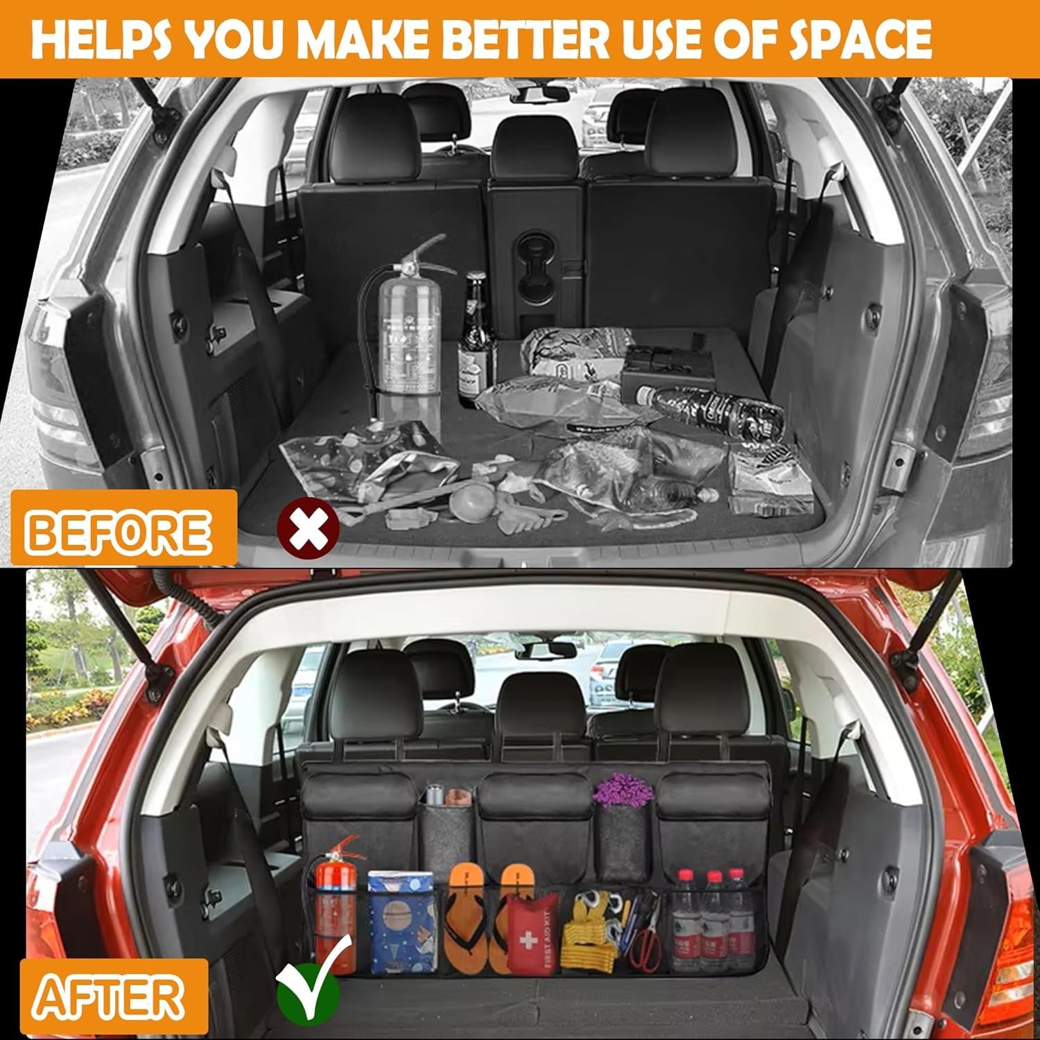 Upgraded Capacity: The car trunk organizer has been improved and upgraded with increased capacity, measuring 42 inches x 20 inches, providing enough storage space with 5 cloth and 4 mesh pockets. Moreover, it can be folded up when not in use which is very convenient. Good Strength: The car organizer is made of durable 600D Oxford which is durable, waterproof and tear resistance. The Back-Needle Edge Sealing reinforces pockets and straps, significantly increasing tear resistance. It has good weight-bearing properties, excellent quality fabrics and is very durable. Good Organization Design: The 5 pockets and 4 mesh pockets are large enough to hold daily in-car necessities, emergency equipment, tools, toys, food, and other miscellaneous items. At the same time, the bag hangs on the seat and does not take up floor space in the trunk, allowing for better space utilization. Stable and Durable: The car trunk organizer is a buckle strap design, firm and stable, at the same time, you can adjust the length of the buckle strap so as to adapt to the seat; the back of the trunk organizer also has a circle of Velcro, which can be attached to the seat to make the car organizer fit better, with better stability and continuity. (Note: The Velcro design suitable for seat back for felt material, not for leather, glossy, or suede.) Easy to Install: This car trunk organizer comes with three straps with clipable buckles for free length adjustment. Simply attach the tower buckles around the headrests and attach the back Velcro mount and you're done. The entire process can be completed in less than three minutes. This hanging trunk organizer is suitable for SUVs, Jeeps, trunks, minivans and other car types.