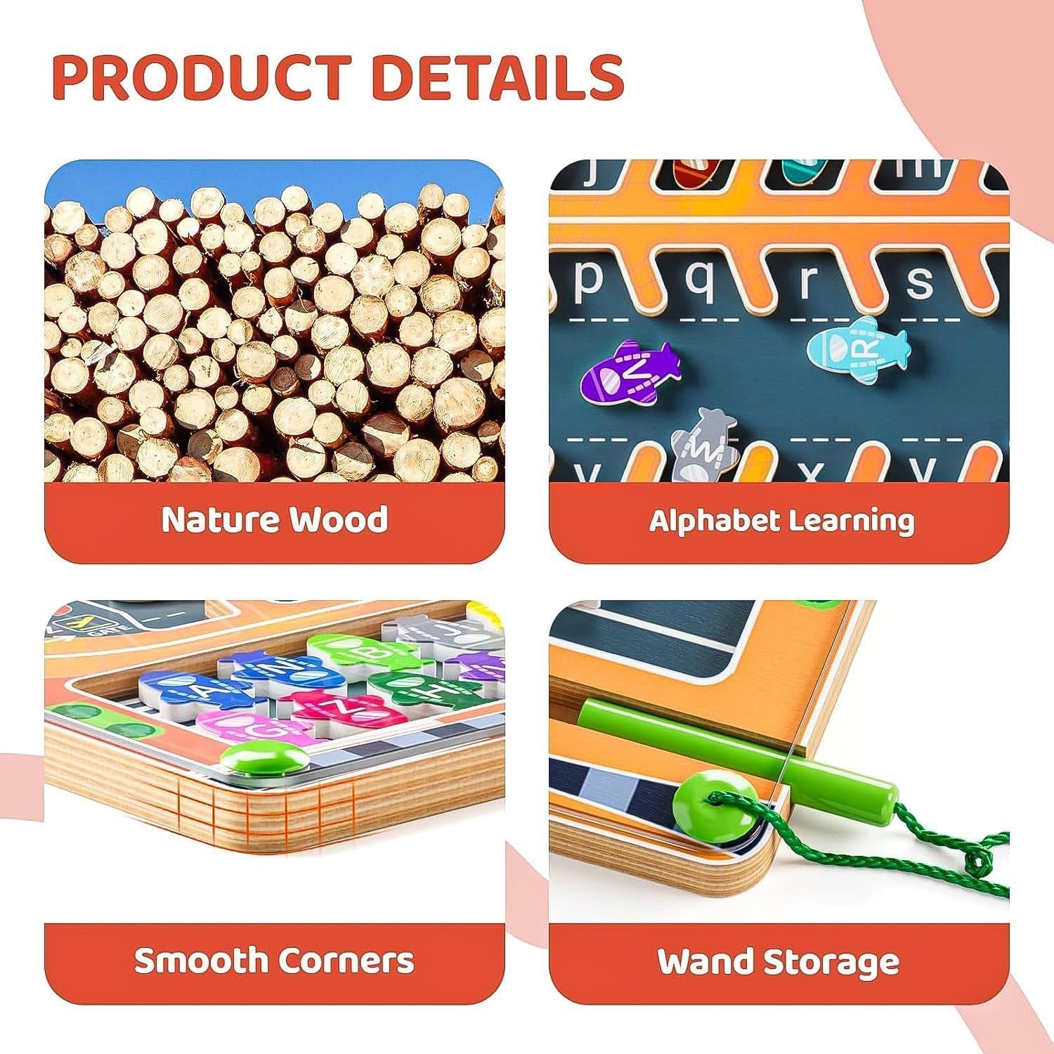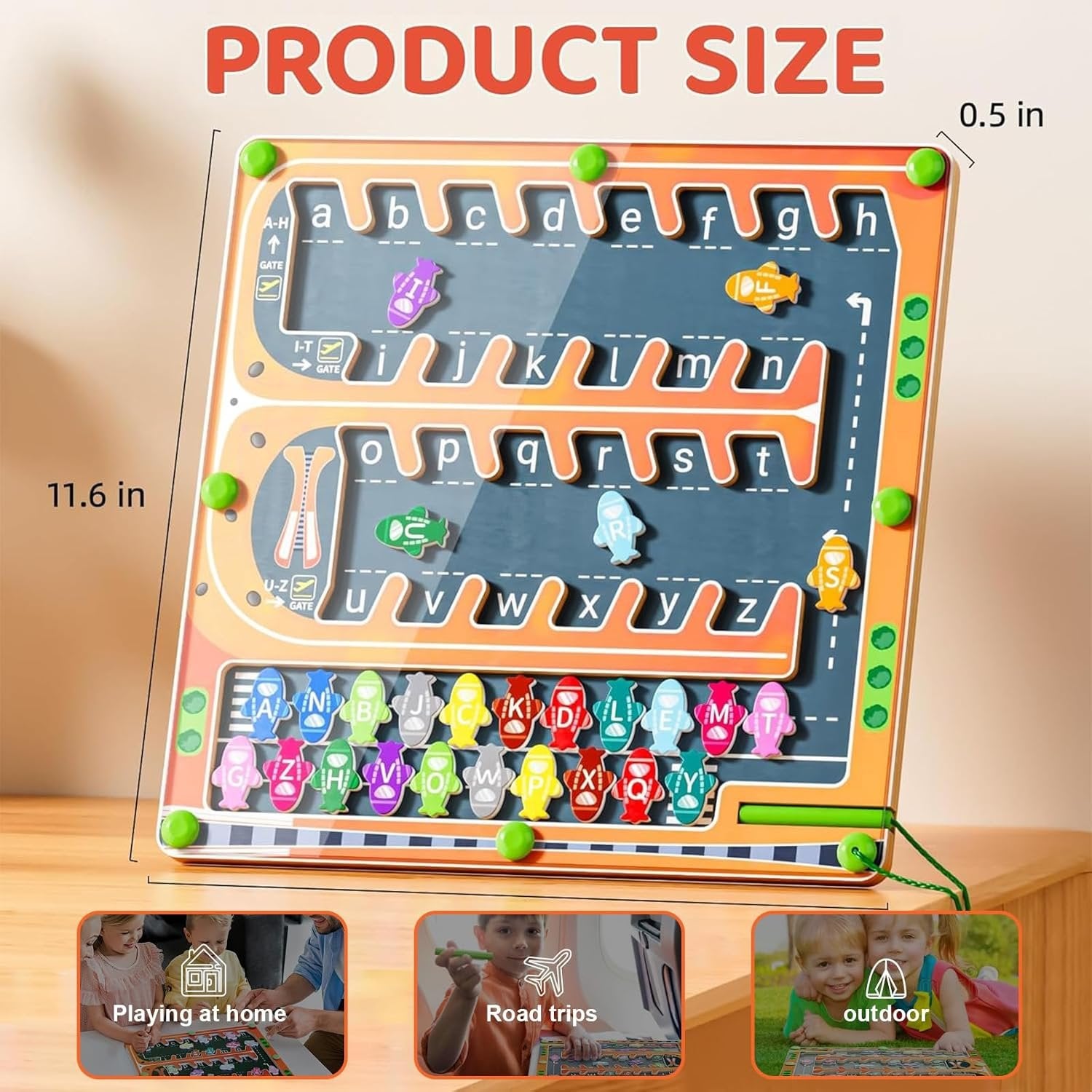 Educational and Interactive: The magnetic alphabet letter maze toy is a fun and engaging way for children to learn about letters; With its colorful design and magnetic letters; kids can enjoy hours of educational playtime Safe and Durable: The montessori maze toy is made of high-quality materials that are safe for children; The magnetic letters are securely attached to the surface; ensuring they won't get lost easily; The toy is built to withstand rough play and is durable enough to last for a long time; providing endless hours of learning and entertainment Portable and Compact: The magnetic letter maze toy is designed to be portable and compact; It can be easily carried around; making it a great on-the-go toy for long car rides, trips, or even for use at home; The compact size also ensures easy storage when not in use Maze Design: The wooden toy features a maze with various paths and obstacles; Children have to navigate the magnetic letters through the maze; finding the correct path to complete words or reach a specific target; It challenges their problem-solving skills and spatial awareness Perfect Toy Idea: The magnetic alphabet puzzle board is a great toy idea for kids and toddlers; Perfect toy idea for Christmas, Halloween, New Year, birthdays, holidays, travel and other special occasions