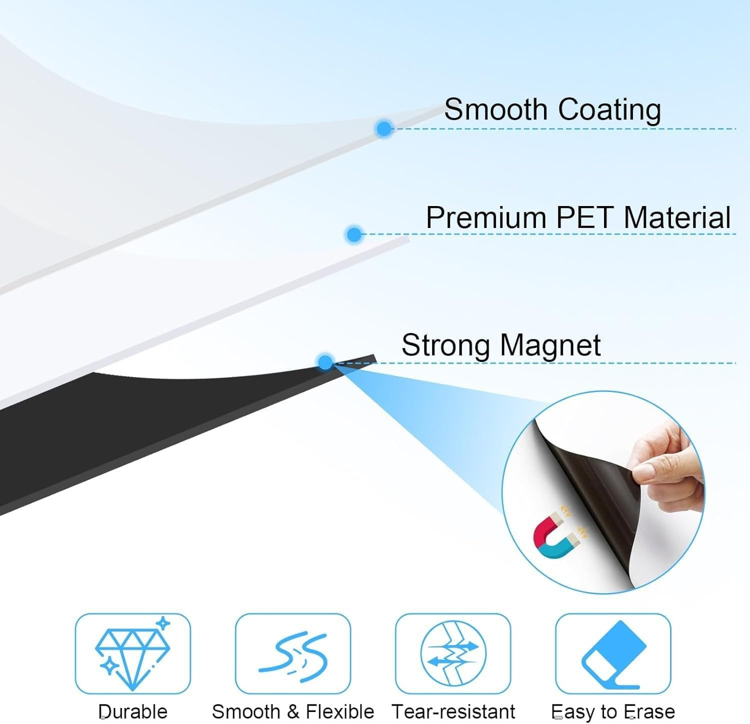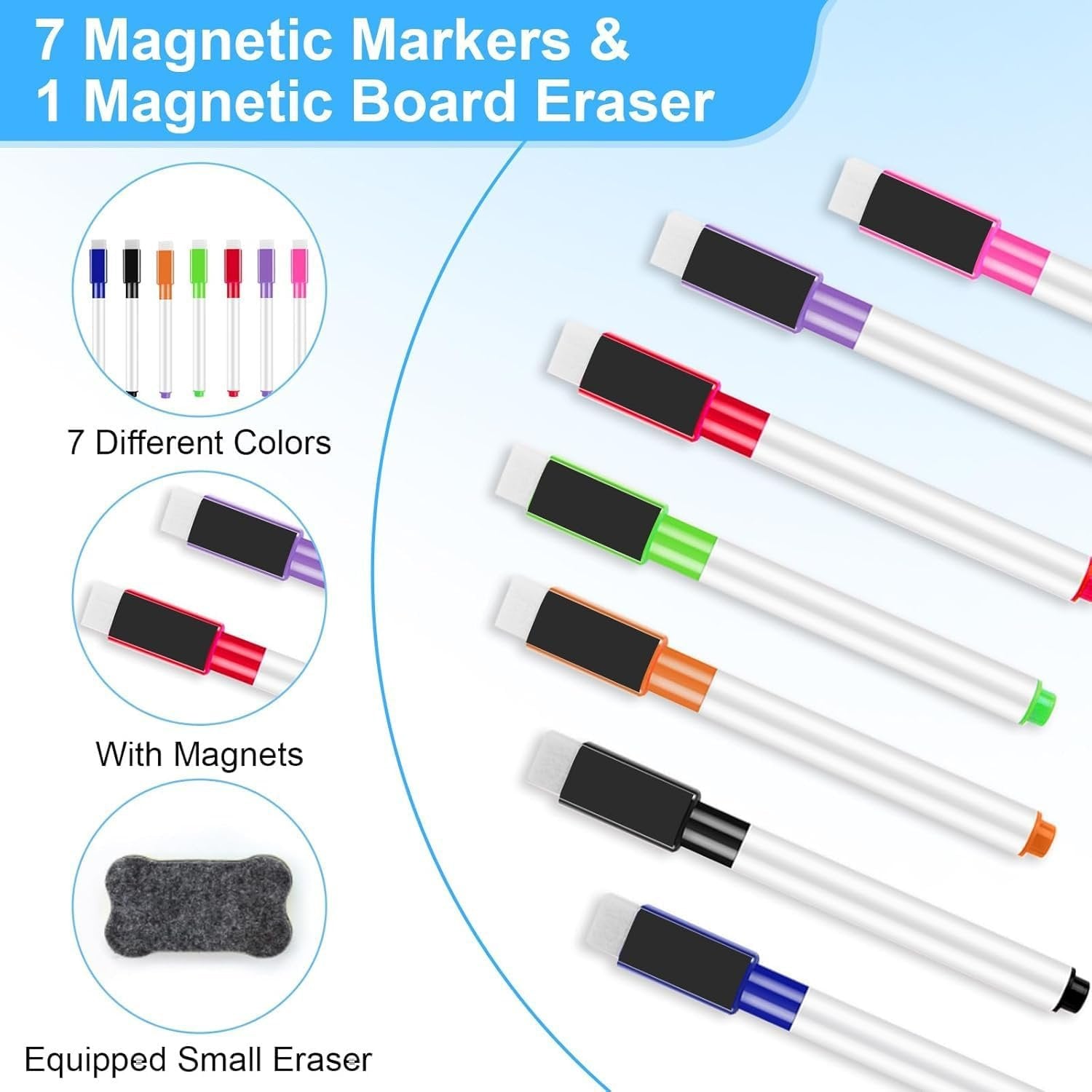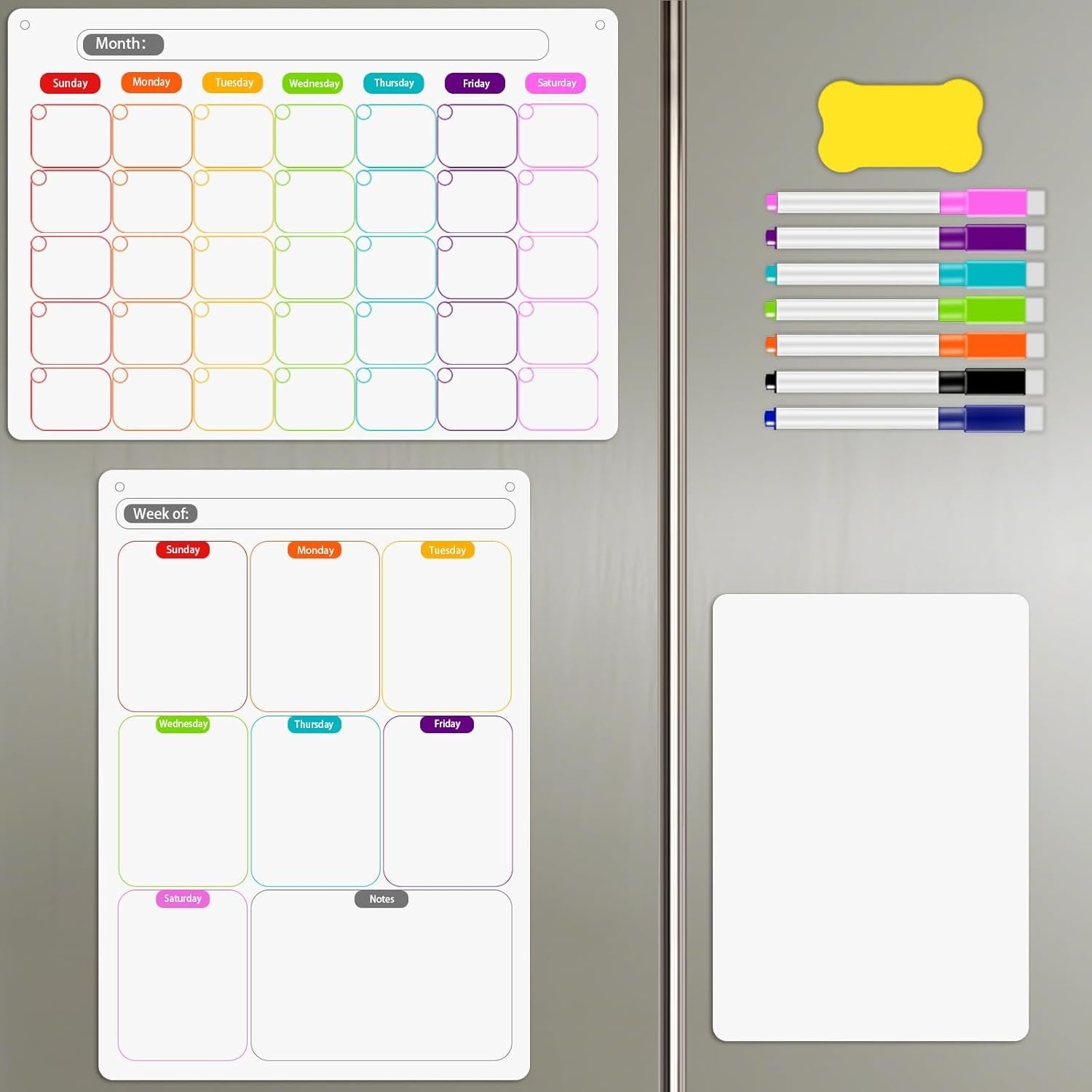 THICKENED NO-SLIP MAGNETIC DESIGN - Engineered with tear-resistant, thickened magnets to stay firmly attached to refrigerators, walls, or metal surfaces without slipping, bending, or bubbling—ideal for busy households and offices. EFFORTLESS WRITING & STAIN-FREE CLEANING - Premium PP+PET laminated surface resists ghosting and stains; wipe clean instantly with the included eraser or a damp cloth for endless reuse. 3-IN-1 PLANNING SYSTEM - Track monthly goals, weekly schedules, and daily tasks on separate boards. Perfect for managing family activities, meal prep, appointments, and nutrition plans with clear visual organization. HEALTH-FOCUSED KITCHEN ORGANIZATION - Design balanced meals and grocery lists to ensure family’s nutritional needs are met. Use the horizontal layout (42x30cm、30x22cm) to fit mini or full-sized fridges, keeping meal plans and chores visible. READY-TO-USE KIT WITH LIFETIME VALUE - Includes 3 magnetic calendars, 7 vibrant markers (non-toxic, low-odor), and 1 magnetic eraser—all reusable and built to last for years.