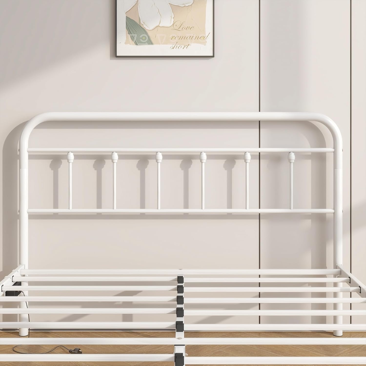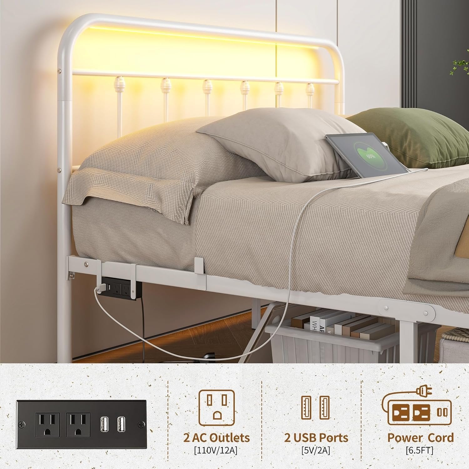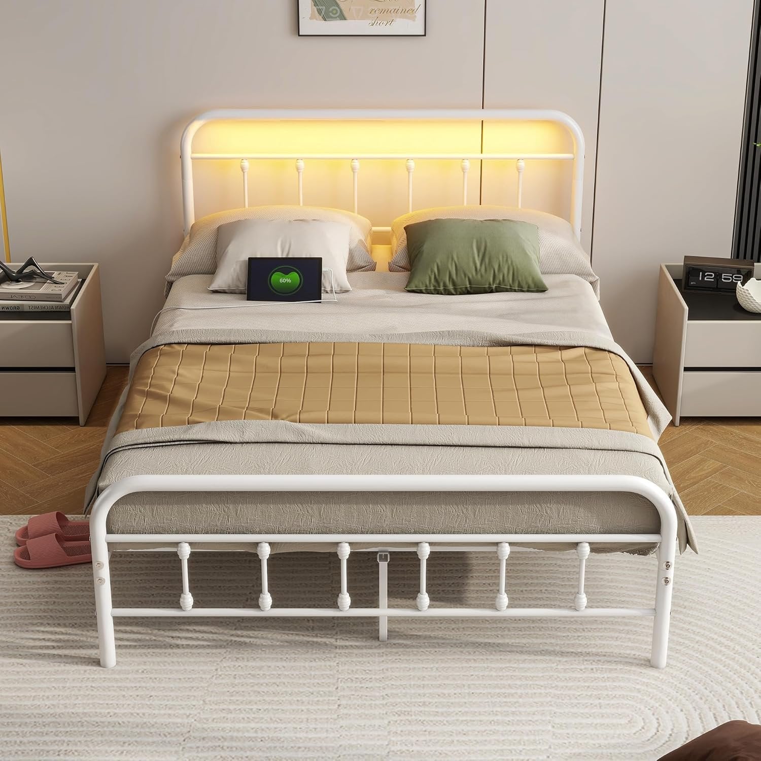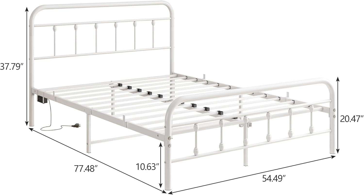 【Full Bed Frame with LED Headboard:】The full bed frame with led lights offering colors options, from gentle shimmer to party color, steady soft light to constant flashing color light. Multiple bed frame lighting modes create a wonderful ambiance to your liking and make the night colorful! 【Bed Frame Full Size with Charging Station:】The base de lit double features 2 USB ports and 2 Type-C port,which is easily charge your tablet, phone, or other gadgets and allowing the use of a book light while you relax in bed. 【Sturdy Metal Slat Platform:】The white double bed frame with headboard is made of high-quality metal and multiple support legs for stability and durability; offer great mattress support. No box spring needed. 【Under-Bed Storage: 】Under thoughtfully designed of our metal bed frame,there is a 10.6-inch under-bed storage maximizes space, providing you maximize bedroom space and keep your room neat and tidy for belongings and effortlessly contributing to a neat and organized bedroom. 【Easy to assemble】Bed frame double comes flat-packed in one box for easy home assembly.All parts with clearly label,easy to assemble with very clear instructions for installation.Follow the included manual for free standing towel rack for quick installation. 【Worry free warranty】 Our Bed frame come with worry-free after-sales service with free replacement parts in 12 months. If you have any questions, please feel free to contact us,we will reply to you within 24 hours.