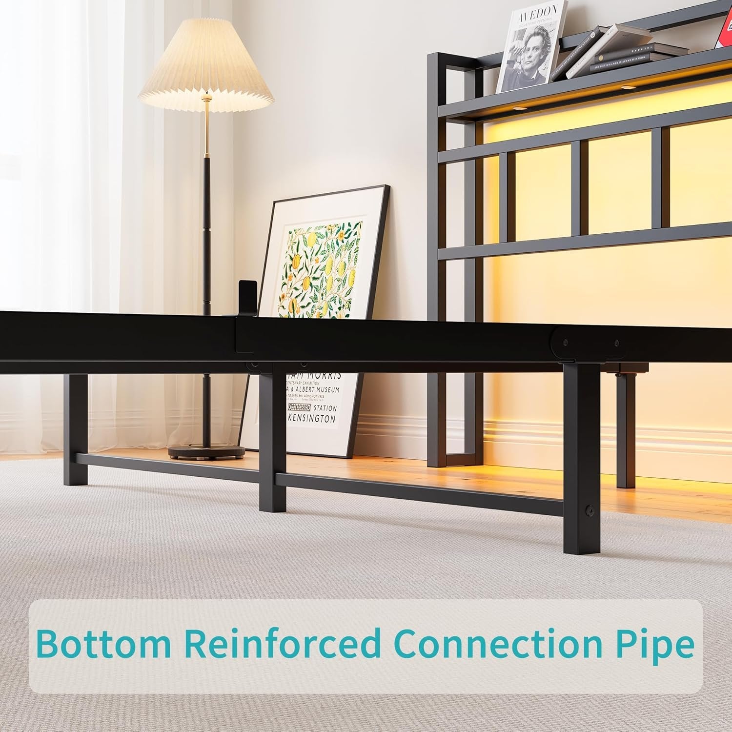 【Multi-functional Led Bed Frame:】The queen bed frame led lights bed frame supports the headboard RGB LED lights, from gentle shimmer to party color, steady soft light to constant flashing color light. Multiple bed frame lighting modes create a wonderful ambiance to your liking and make the night colorful! 【Headboard Storage Shelves with Charging Station:】The black queen bed frame features convenient headboard shelves and charging station,which is easily charge your tablet, phone, or other gadgets and offering easy access to essentials and extra space to showcase your favorite decor, such as phones, glasses, and books within easy reach. 【Sturdy Metal Slat Platform:】The queen bed frame with headboard is made of high-quality metal and multiple support legs for stability and durability; offer great mattress support. No box spring needed. 【Under-Bed Storage: 】Under thoughtfully designed of our metal bed frame,there is a 10.6-inch under-bed storage maximizes space, providing you maximize bedroom space and keep your room neat and tidy for belongings and effortlessly contributing to a neat and organized bedroom. 【Easy to assemble】The queen bed with storage comes flat-packed in one box for easy home assembly.All parts with clearly label,easy to assemble with very clear instructions for installation.Follow the included manual for free standing towel rack for quick installation. 【Worry free warranty】 Our bed frame come with worry-free after-sales service with free replacement parts. If you have any questions, please feel free to contact us,we will reply to you within 24 hours.
