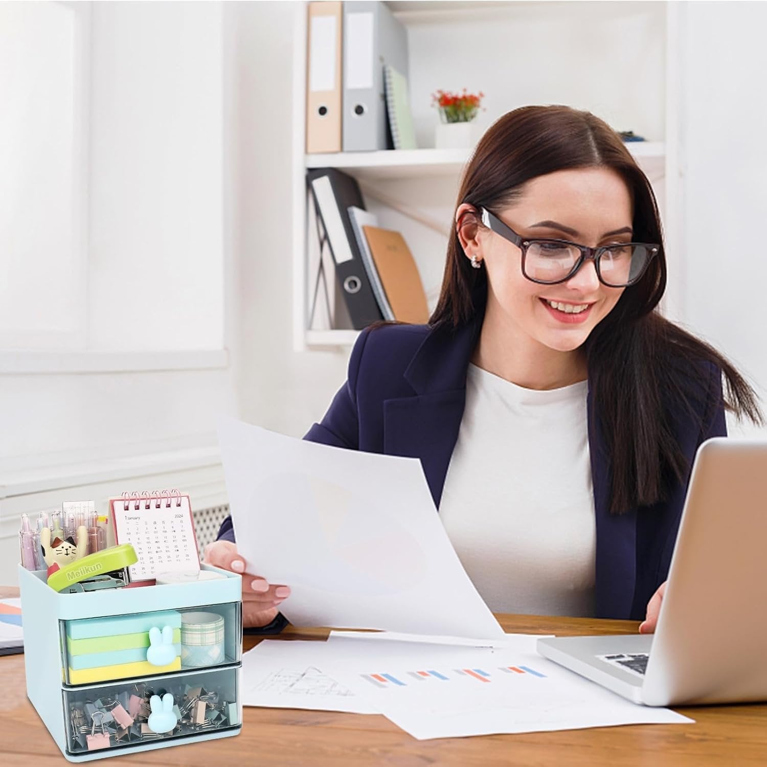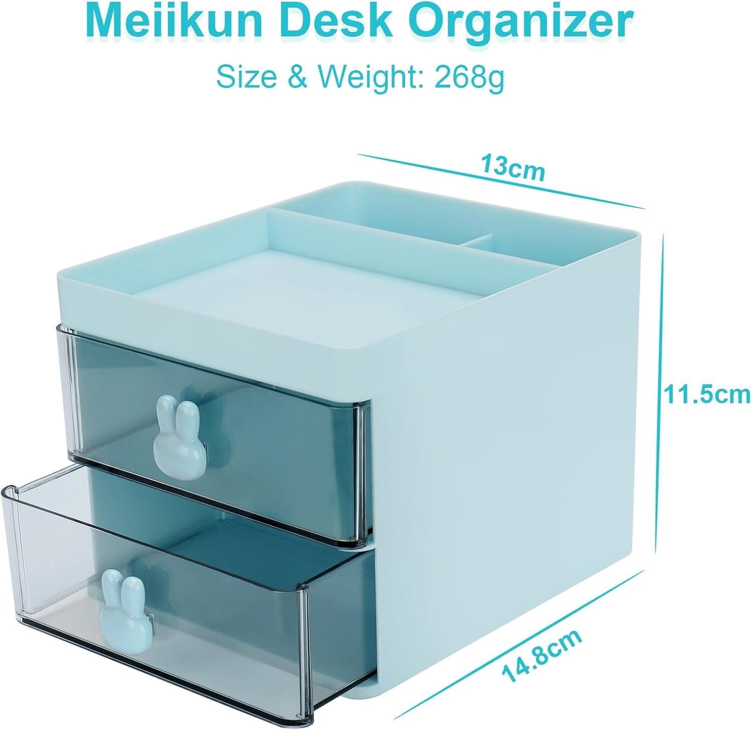 Desk Organizer Size: Meiikun Desk Organization with 2 drawers, 2 compartments and a top tray. Desk Organizers and storage overall size are 13 x 14.8 x 11.5 cm / 5.1 x 5.8 x 4.5 inches, which is the ideal size to organize stationery and office supplies. Practical desk accessories require no assembly Durable Desktop Organizer: Office Desk Organizer is made of high quality ABS material to ensure long term use of stationery organizer. Small desk organizer features sturdy structure, smooth surface, waterproof and easy to clean Space Saving: Pen Organizer is a useful tool for keeping your desktop organized and maximizing space. Compartmentalized desk caddy for partition classification and orderly storage, creating a more efficient office or study environment Practical Design: Desk Organizer Drawer features a cute rabbit handle that allows for smooth pulling and pushing, providing easy access to the contents. Transparent drawer, you can see the items at a glance. Drawer storage is dustproof, simple appearance, pretty color, versatile and practical Multifunctional Desktop Storage: Pencil holder is not only designed to store office supplies such as pens, sticky notes, paper clips, and scissors, but it can also be used as a desk organization for cosmetics, jewelry, craft materials, and more. Note: Please check the product size carefully
