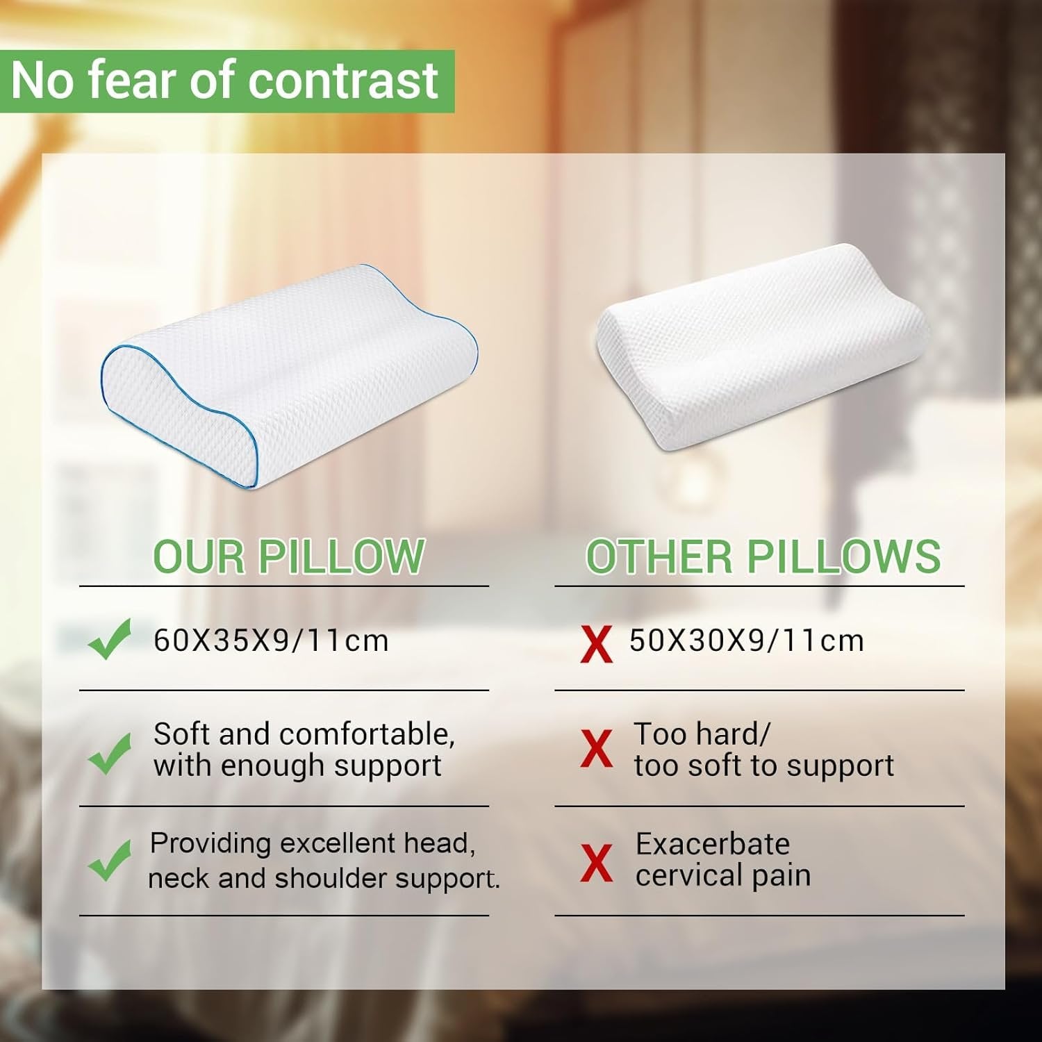 đ€ăAdvanced Memory Foamă RIPPLE memory foam pillow is made of high-quality, slow-stretch memory foam, which has support properties.allowing you to fall asleep faster and more comfortably. đ€ăNew Pillowă The neck pillow has been carefully designed based on the recommendations of sleep experts and is ergonomic. The unique design offers the best sleep quality for all sleeping positions. đ€ăTwo Heights Meet Different Needsă 60 * 35cm pillow adopts high-low curve design, which is in line with ergonomic design. The 9 cm low curve is suitable for people who are used to low pillows and sleep on their backs; the 11 cm tall curve is suitable for people who are used to high pillows. đ€ăSoft and Neck ProtectorăPillow adopts open cell structure. It does not change the degree of softness or hardness with changes in temperature, and it can adapt to the neck in all directions. It is very suitable for office workers, old people and students. đ€ăBest Customer Serviceă The Ripple team is committed to providing you with quality sleep. If you are not satisfied with the product you purchased, please feel free to contact us and we will provide you with a satisfactory solution.