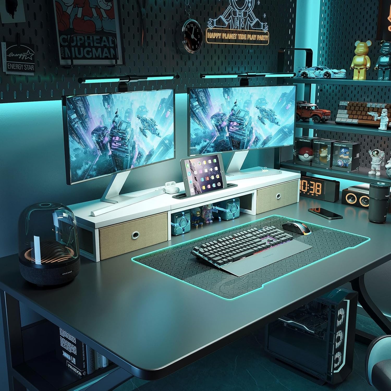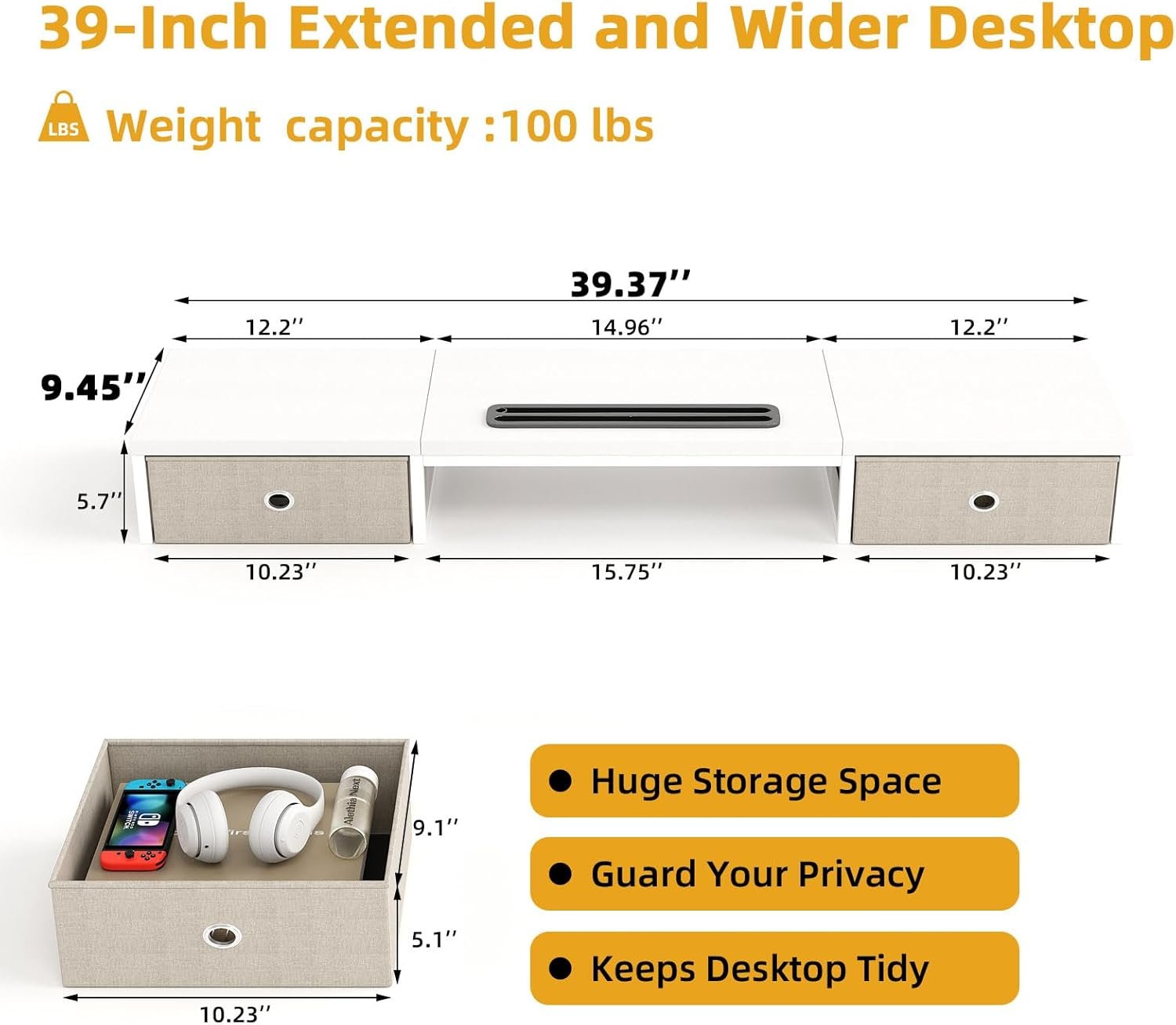 Dimensional Excellence: Our Monitor Stand measures 39.4 (W) x 9.4 (D) x 5.7 (H) inches, providing the perfect fit for your computer setup. The stand features two practical slide-out drawers, which offer ample storage space for office supplies and accessories. Make your desk more functional and organized. Enhance your work efficiency Spacious Storage Solution: Designed to accommodate 2-3 monitors, our versatile stand is perfect for multiple screens environments. Not only can it hold monitors, laptops, and televisions, but it can also serve as a convenient bookshelf for books, manuals, magazines, and more. Make the most of your workspace with our innovative storage design Sturdy & Durable: Crafted with a sturdy construction and a wood finish, clean lines and modern looking, our dual monitor stand delivers both sleek and reliability. Made of high quality MDF wood, this stand is water and stain-resistant. The premium wood provides a strong and smooth surface. With a maximum weight capacity of 100 lbs, this stand is durable and sturdy for long service time Ergonomic Design: Enjoy the benefits of an ergonomic workstation with our monitor stand. By raising the monitor to eye level with its 4-inch height, it promotes proper posture and relieves neck and back discomfort. There's plenty of room to store items both underneath and as well as beside the monitor on the stand Easy to Assemble: Installation manual is provided. All parts are incleded, and the computer stand is assembled exactly as described. Easy to put together within 5 minutes. If you have any questions, please feel free to contact us, our after-sales support team will reply you promptly