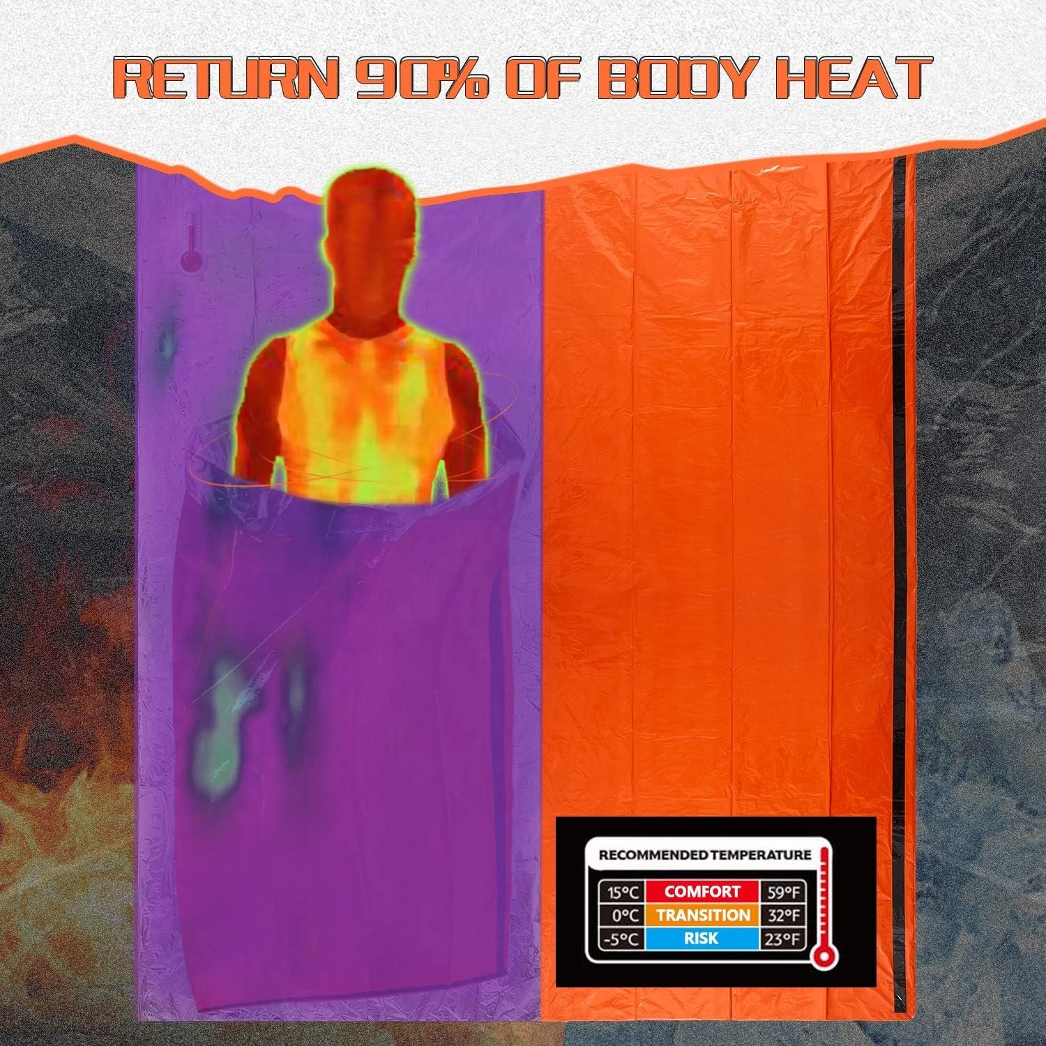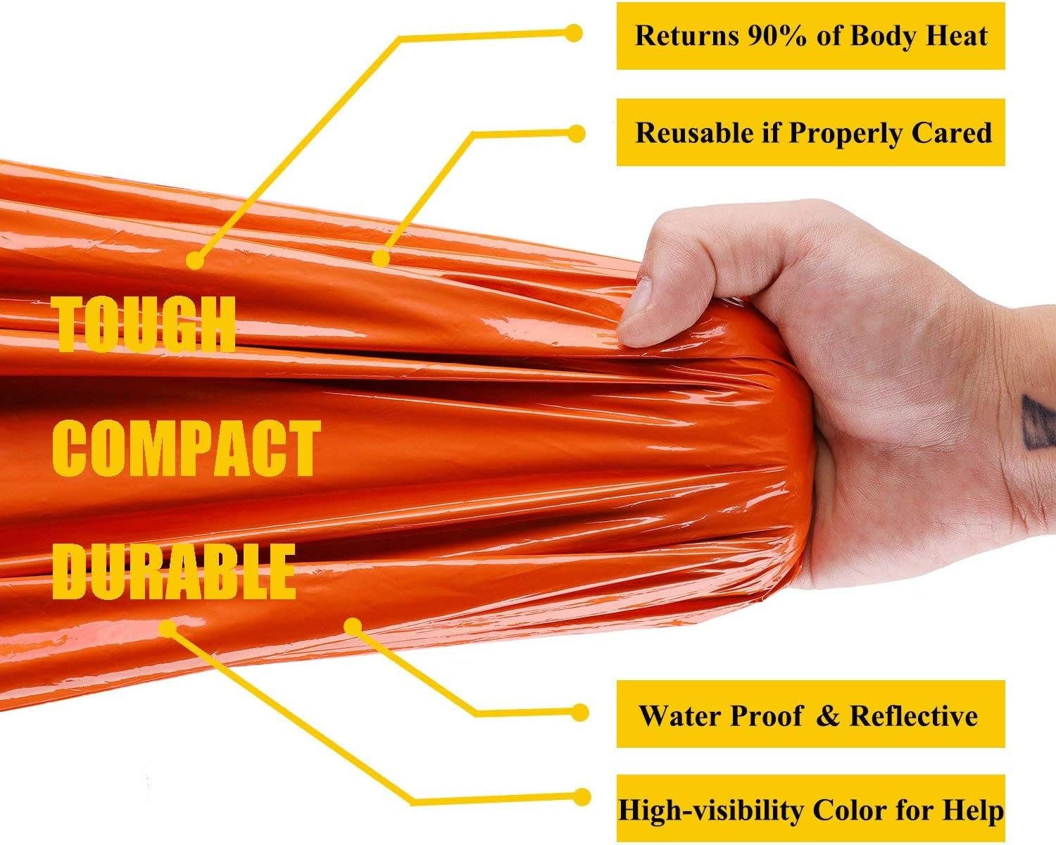 ULTRA LIGHTWEIGHT COMPACT: The thermal sleeping bag is kept in a small 3.9*5.1-inch bag and weighs only 4.2 ounces. Let you repeat use at any time, you can carry and can be stored in any place, store it in your car, backpack, and emergency first-aid case, etc. It can be easy to find when you have an emergency sleeping bag, and Mezonn emergency heat-resistant Mylar bag is perfect for all emergencies. STAY WARM OVER 24 HOURS: Made out of ultra-lightweight PE material which reflects 90% of your body's heat to you reflective, and its orange color makes it easy for rescuers to find you(And its green color is not easy to see), making it an essential survival tool, Suitable for outdoor camping and hunting, emergency shelter or car emergency kit. INCREDIBLY DURABLE: The weight of this sleeping bag and the ultra-thin thickness of 28UM make it surprisingly strong. The material ensures a tear-resistant, windproof and waterproof sleeping bag. Besides, this emergency bivvy bag has reinforced tape seams that create a weather-resistant barrier between you and the cold. BIG SIZE: 37 * 80.7 inches is enough to wrap an adult's body, you can also use it as an emergency blanket for two adults in an emergency. It can also perform other functions, such as emergency blankets, awnings, emergency sleeping bags, floor mats, rescue or distress beacons, ponchos, awnings or sunshades. MONEY BACK GUARANTEE: Our goal is to keep each customer satisfied. If you are not satisfied for any reason, we will refund the full amount without asking any questions.